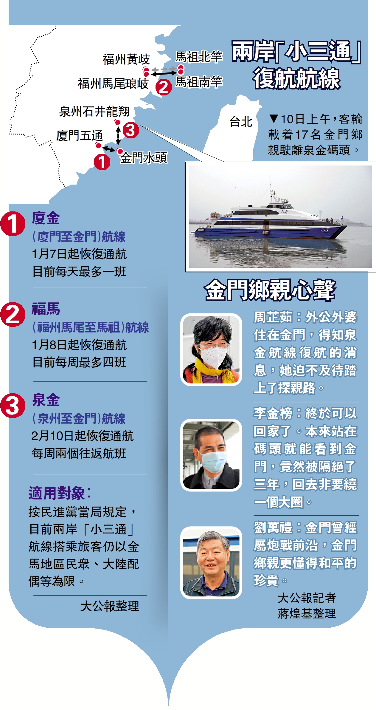 (大公報 記者 蔣煌基 泉州報道)繼廈金、福馬航線1月初復航後,中斷三年的泉州至金門的「小三通」客運航線(即泉金航線)10日起恢復通航。金門鄉親洪超雄現場掩飾不住興奮,「女兒1歲在金門打完疫苗回到泉州後,『小三通』就中斷了,現在女兒4歲了,小傢伙已經三年沒回金門了。」有台商表示,目前廈金、福馬、泉金航線只是有限復航,與廣大台胞期盼還有很大差距,希望民進黨當局再放寬搭乘資格,讓台商盼回家路更便利。