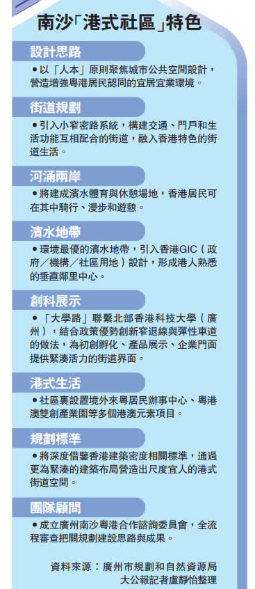 「我們將利用『南沙土地+香港經驗』,充分借鑒香港城市運營經驗,注重『港人、港企、港規則』與『校區─園區─社區』融合的建設理念,在設計、規劃、管理和開發四個方面進行創新,提升南沙城市建設水平,為香港融入國家發展大局提供物理支點。」廣州市規劃和自然資源局南沙區分局的工作人員介紹道。記者了解到,港式社區還會重點開發南沙環境最優的濱水地帶,設計引入香港GIC(政府/機構/社區用地)模式,屆時將混合社區會堂、體育運動、社會福利、行政服務等功能,形成港人熟悉的垂直鄰里中心。