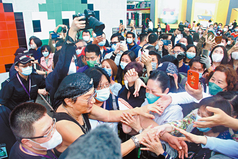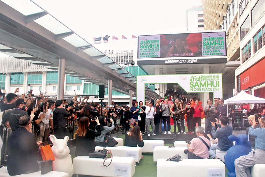 (香港文匯報記者 達里)為紀念廣東歌50周年,許冠傑(Sam)昨日舉行記者會宣布於4月7至12日假紅館舉行6場《許冠傑此時此處演唱會2023》,穿上黑色背心和皮褲,架上墨鏡的Sam,在尖沙咀地標五支旗杆以歌會友,唱出經典歌《阿郎戀曲》、《快樂》和《鐵塔凌雲》熱身,吸引過百歌迷圍觀,Sam更親民地走到歌迷前握手及合照留念。