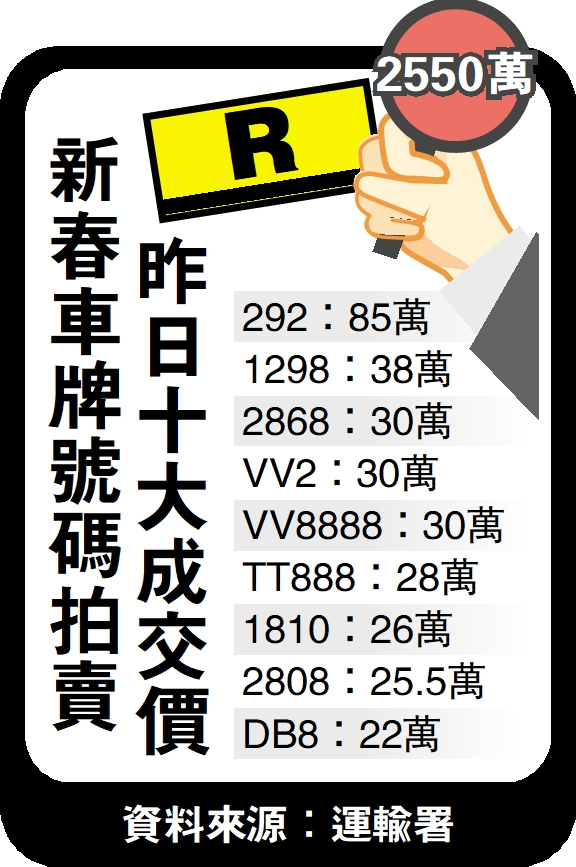 千金難買心頭好,在昨日運輸署的兔年新春車牌拍賣場上,自訂車牌「R」便獲得一眾人士爭相開出天價,最終在拉鋸59口價後,以2550萬元的價格,由一位手持叫價編號牌「123」的女士投得,是底價5000元的5100倍,僅次於歷來最高「身價」車牌「W」的2600萬元,成為歷來第二貴的車牌。
