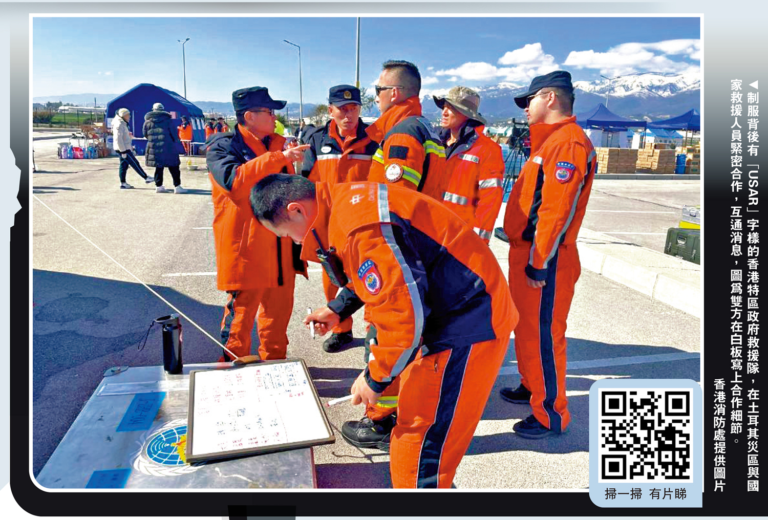 救援隊昨日(12日)接受香港傳媒視像訪問,其間當地仍有餘震,視像信號短暫波動,無礙救援隊講述當地搜救情況。特區救援隊指揮官于文陽表示於2月10月到達土耳其哈塔伊省,參與聯合國救援協調小組會議後,救援隊接獲指派任務,帶同無人機、搜救犬及其他救援裝備,隨即在災區展開搜救工作。