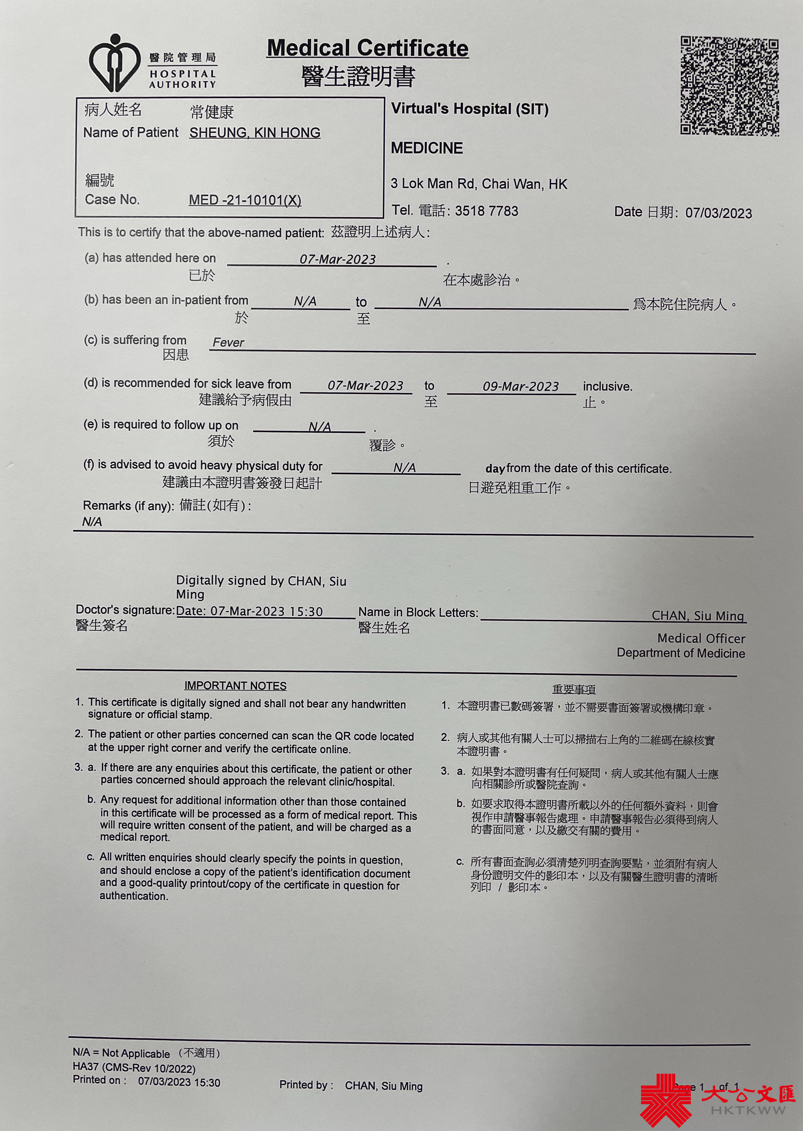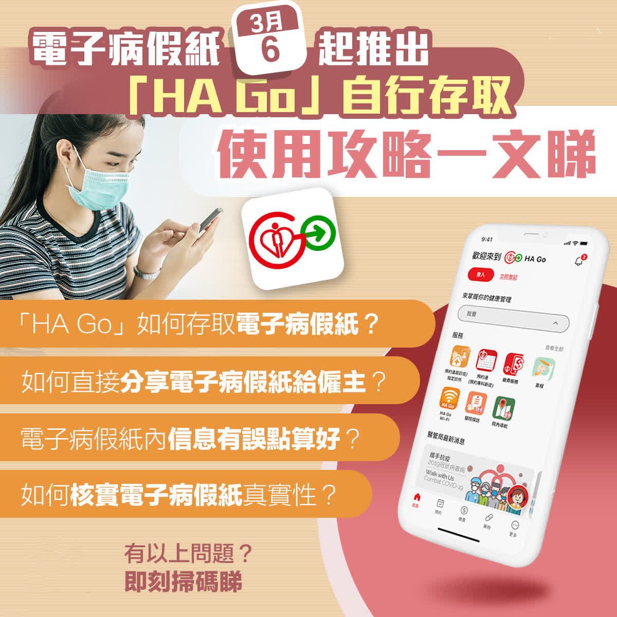 醫院管理局醫療信息主管彭育華醫生表示,透過CMS管理系統,給醫生發病假紙,醫生的電子簽署會取代醫生現場簽署。除了會有實體紙張,如果病人也是「HA Go」使用者,可以進入小程序直接分享病假紙給僱主。進入「HA Go」小程序,然後選擇「我的紀錄」,可以隨時隨地看到醫生證明書。