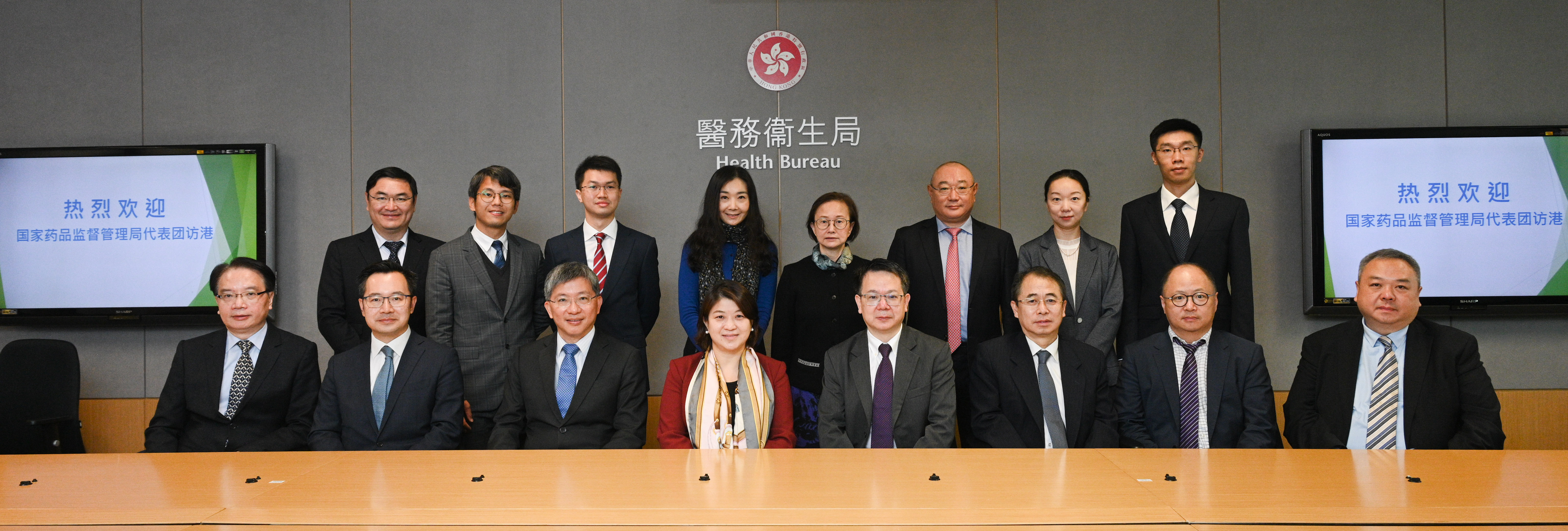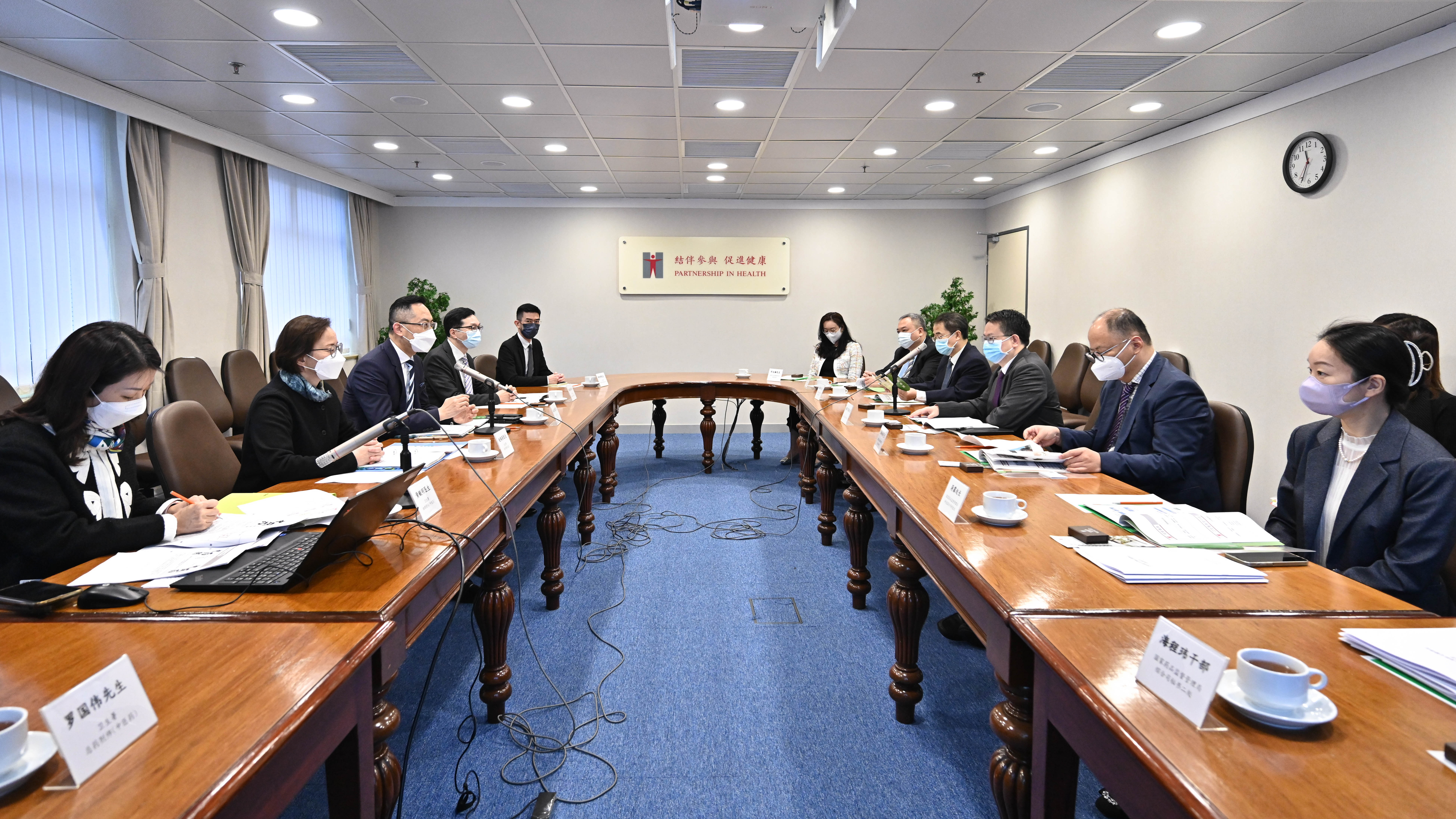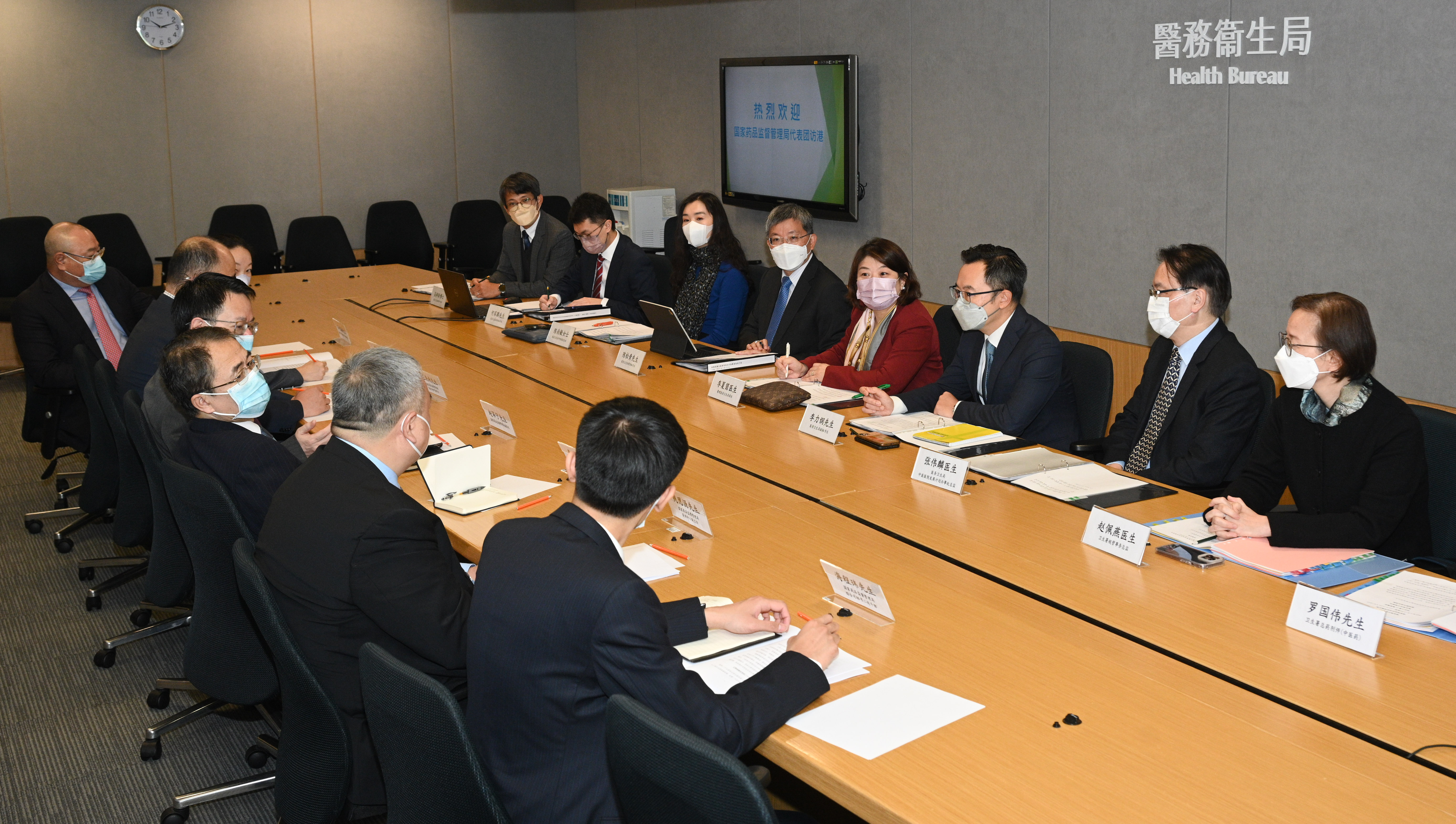 代表團隨後與衞生署署長林文健醫生會面。衞生署於會議上向代表團介紹本港中藥規管架構及發展概況。雙方就中藥檢測、標準研究領域、提升中藥質量及安全水平各方面的合作,深入交流討論。