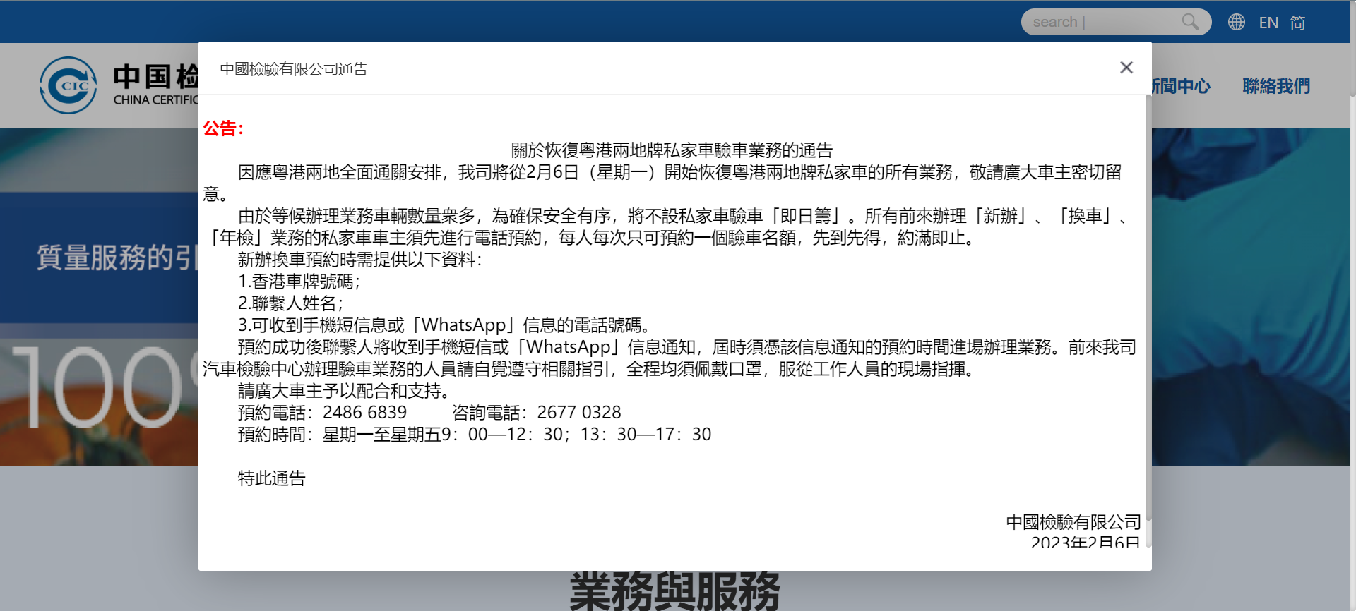 (大公文匯全媒體記者 馮沛賢)持有兩地跨境牌的私家車車主,目前北上規定車輛必須每年分別在香港及內地各驗車一次,方可在兩地行駛,雖然香港與內地今年初起恢復通關,但過去疫情影響,令本港部分過境車輛在出境前往內地或澳門後仍未返港,而其香港的車輛牌照亦已逾期,面臨滯留當地或回港就要被拖車的境況。然而,現時全港只有一間公司「中國檢驗有限公司的汽車檢驗中心」(中檢中心)提供跨境驗車服務。有內地工作的港人嘆言一直未能預約檢車,她與家人更曾現時已為情況作最壞的打算,認為必要時可以直接將車駛回香港,等過關後再等部門處理。