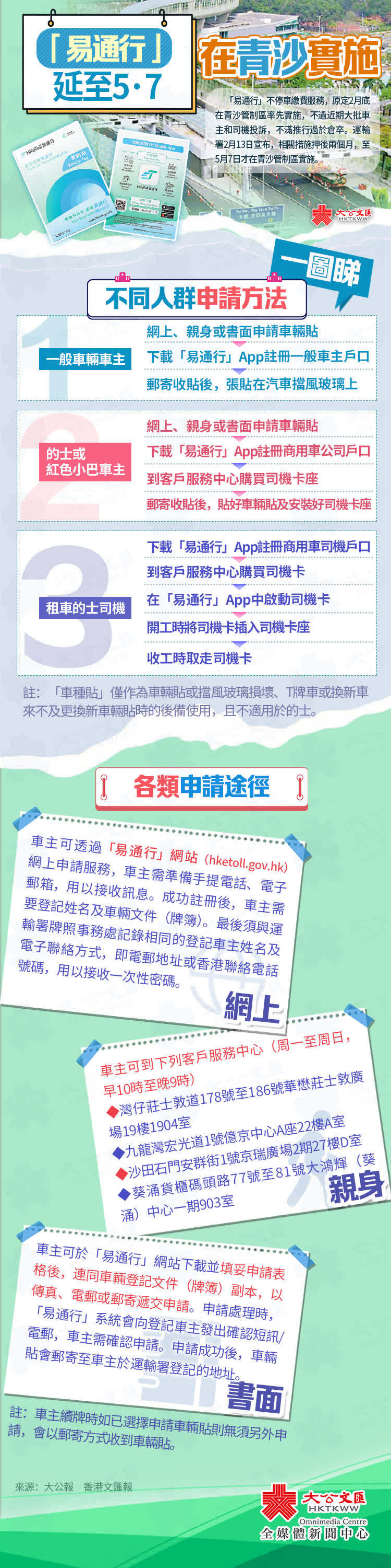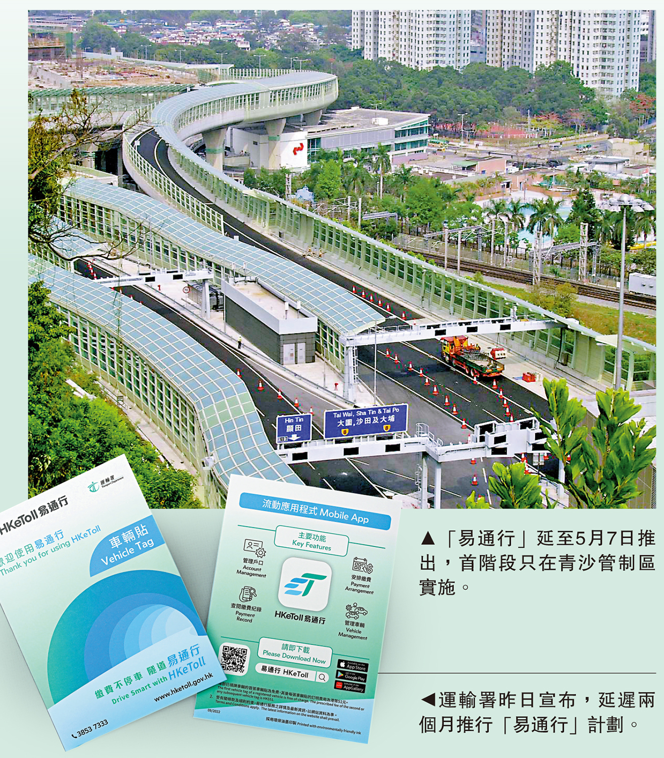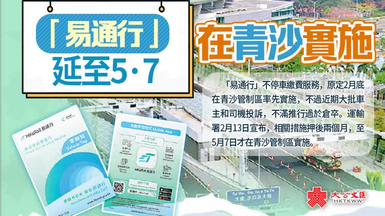 (大公報記者 賴振雄)「易通行」不停車繳費服務,原定本月底在青沙管制區率先實施,不過近期大批車主和司機投訴,不滿推行過於倉卒。運輸署昨日宣布,相關措施押後兩個月,至5月7日才在青沙管制區實施。