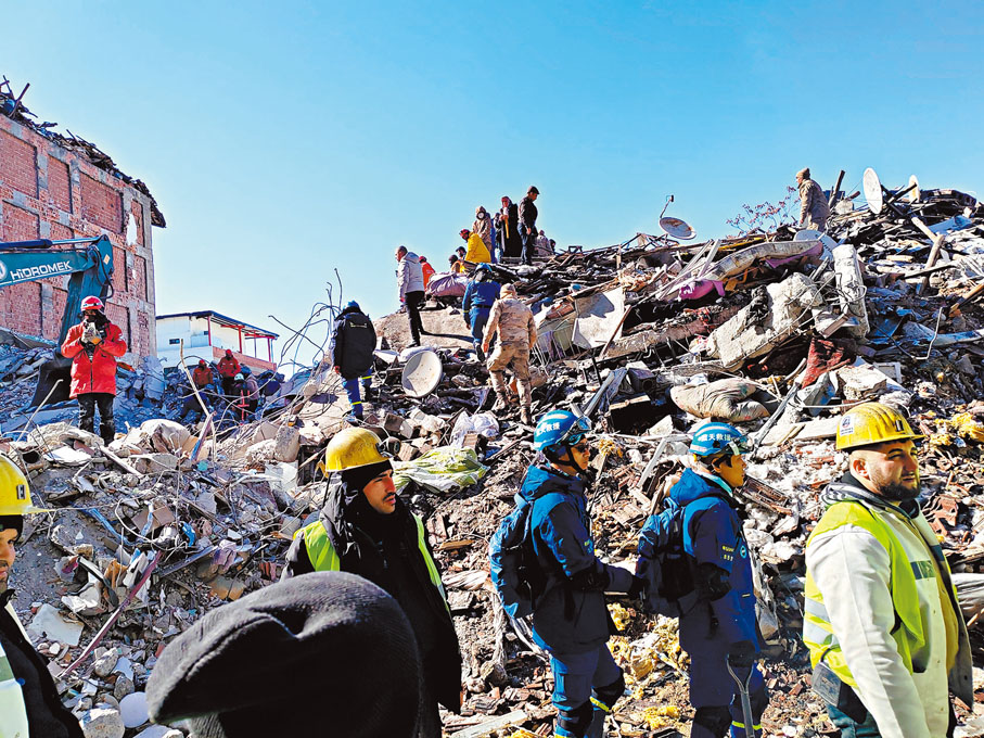 (香港文匯報記者 盧靜怡 廣州報道)截至13日,中國東莞藍天救援隊已有21名成員奔赴土耳其災區參與搜救工作。災區現場白天零下5攝氏度,晚上會達到零下10攝氏度,對於隊員來說,救援現場就像戰場,大家都在爭分奪秒。身穿藍色搜救制服的成員,攀爬在倒塌的建築中持續搜索。13日,東莞藍天救援隊隊長張家傑介紹說:「廣東來了34個人,我們東莞來了21個人,我們主要攜帶了生命探測儀,高精密的探測儀器,主要配合其他組別做生命探測和信號搜索,還會有我們的『蛇眼』裝備作為地下深入攝像頭去探測輔助。」張家傑說:「我們會盡最大的努力,為生命救援提供技術『 通道』!」