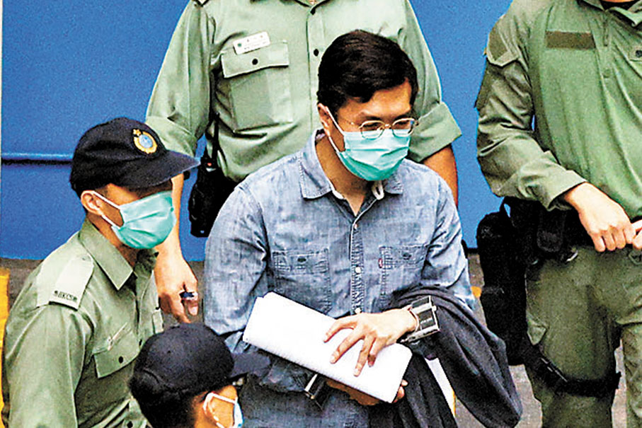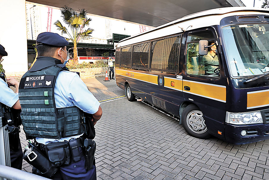 昨日下午,身穿灰色毛衣和深藍色上衣的區諾軒由囚車押到法院,沿途有警方車隊護送,法院外亦有反恐特勤隊持槍戒備。