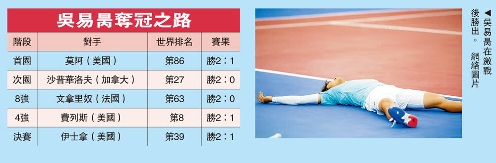 歷經3個「搶七」,在對手整場比賽發出44記ACE球的情況下,取勝後的吳易昺難掩激動。「我為祖國和自己都創造了歷史,我為自己感到驕傲,尤其是要感謝我的球迷與團隊的支持。」他說,「謝謝你們來這邊為我加油,請大家繼續期待我們中國男子網球,我們會為你們帶來更加精彩的表現。」