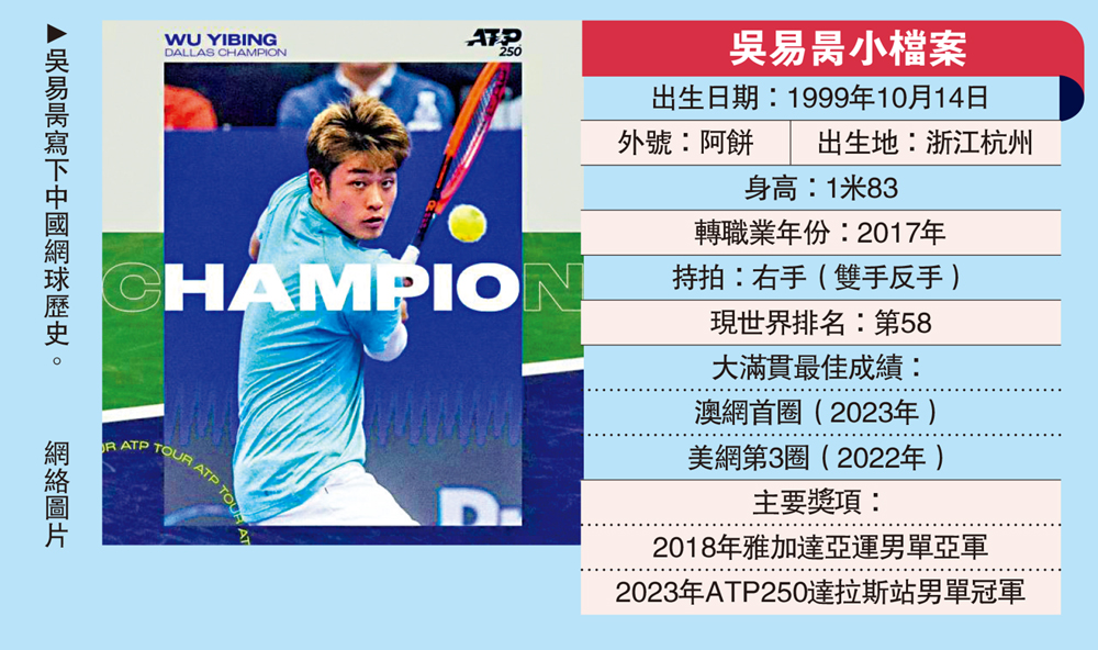 大公報綜合新華社、中新社 記者梁潤森 報道:當地時間12日,在男子職業網球協會(ATP)250巡迴賽美國達拉斯站男單決賽中,中國選手吳易昺經歷鏖戰,以6:7(4)、7:6(3)、7:6(12)戰勝本土選手伊士拿,成為首位捧起ATP巡迴賽單打冠軍的中國大陸球員。