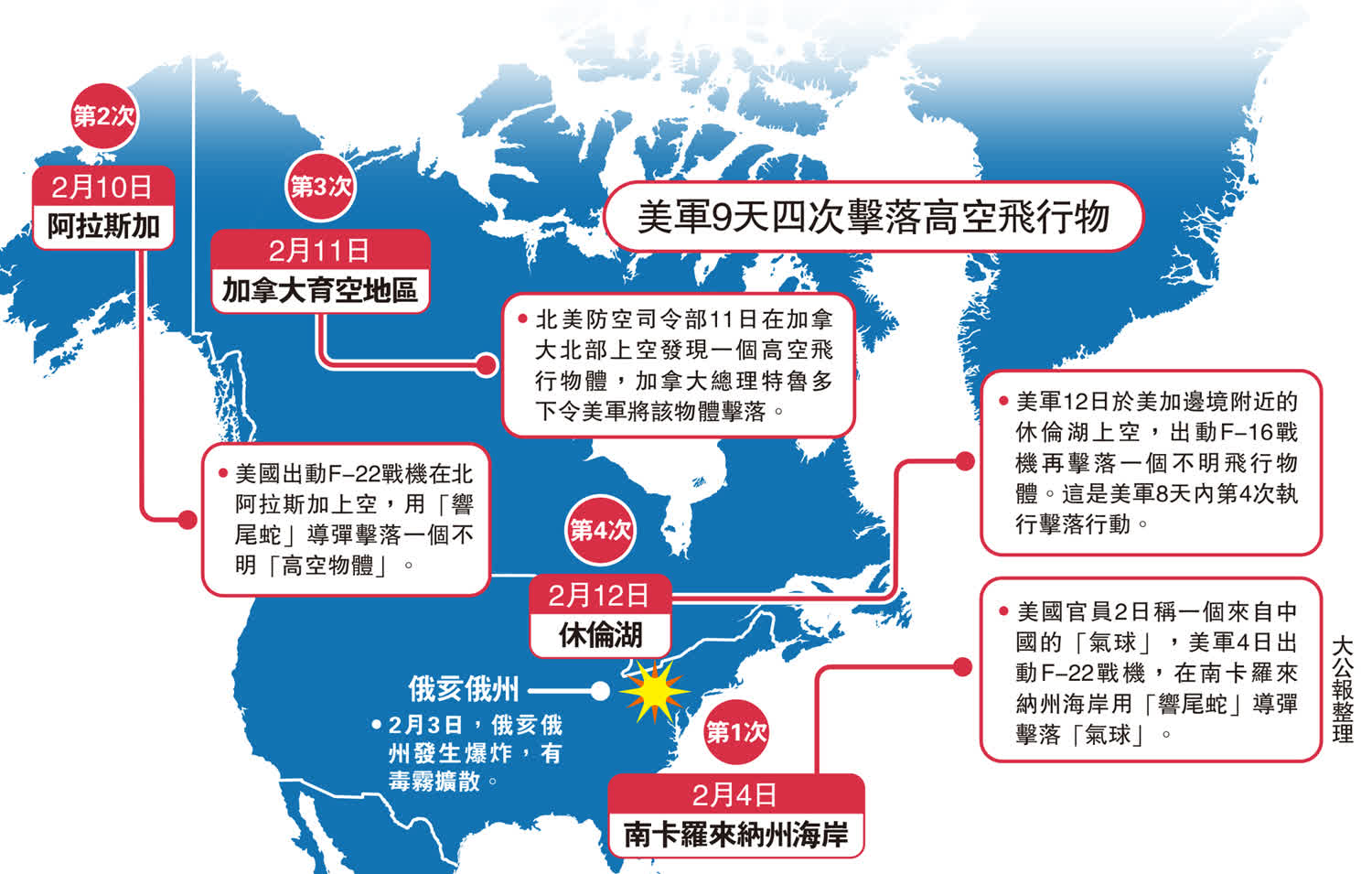 大公報綜合CNN、路透社、CBS報道:美國政府和媒體近期不停炒作擊落「不明高空飛行物」事件,美軍12日宣布在美加邊境的休倫湖上空擊落一個不明飛行物體。這是九天內美軍第四次在美加領空擊落飛行物體,北美防空司令部司令范赫克沒有排除這些飛行物來自外星的可能性。不過,外界有聲音質疑稱,這可能是轉移視線,以掩蓋俄亥俄州一起因為列車出軌而造成的重大環境災難。