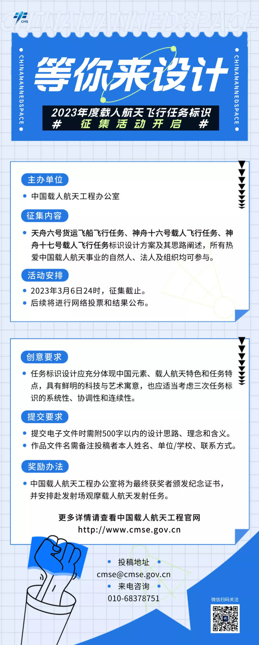 自2003年神舟五號任務起,每次載人飛行任務均設計了任務標識,特別是空間站建造階段策劃設計的12次任務標識,對塑造工程品牌形象、弘揚載人航天精神發揮了積極作用。此次主要徵集天舟六號貨運飛船飛行任務、神舟十六號載人飛行任務、神舟十七號載人飛行任務標識設計方案及其思路闡述,所有熱愛中國載人航天事業的自然人、法人及組織均可參與。作品徵集要求充分體現中國元素、載人航天特色和任務特點,具有鮮明的科技與藝術寓意,適當考慮3次任務標識的系統性、協調性和連續性。徵集活動截止日期為2023年3月6日24時,後續將進行網絡投票和結果公布。