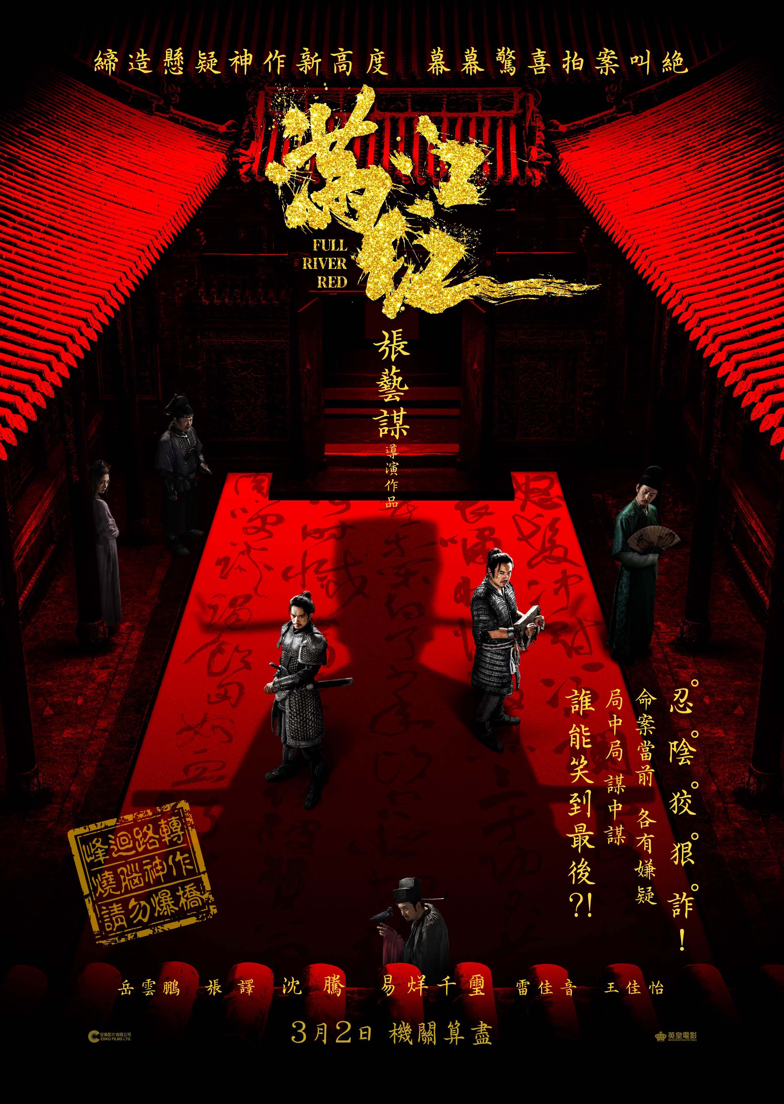 電影《滿江紅》是導演張藝謀入行36周年的自編自導的最新作品,將傳奇故事以全新獨特的角度切入,以一宗奇案出發,帶領觀眾到達一個感官剌激而且需要腦洞大開的觀影世界,令看過的觀眾都大呼耳目一新!當中最讓人嘖嘖稱奇的是張藝謀以畫面說故事的新高度,鏡頭在宅邸中不斷切換視角,沈騰、易烊千璽、張譯、雷佳音、王佳怡、岳雲鵬六位演員甫出場已經充滿儀式感。雖然影片長達近160分鐘,不過兇情發展卻一波未平一波又起,影片節奏爽勁,加上無法預測的鏡頭走向,把觀眾帶入這宗「兇殺案」的迷局之中,並跟隨主演們緊迫的步伐,試圖開啟對真相的追尋。