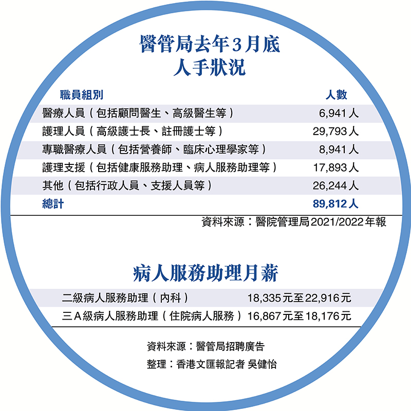 醫管局2021/22年度年報顯示,截至去年3月31日,該局共有89,812名員工,醫療人員(包括顧問醫生、高級醫生等)佔6,941人;護理人員(高級護士長、註冊護士等)佔29,793人;護理支援員工(包括健康服務助理、病人服務助理等)則有17,893人,當中的病人服務助理主要職務是輔助護士,例如為住院病人提供護理服務、照顧起居飲食及個人衞生,以及護送病人、消毒及處理雜務等工作。月薪介乎1.6萬元至2.2萬元。