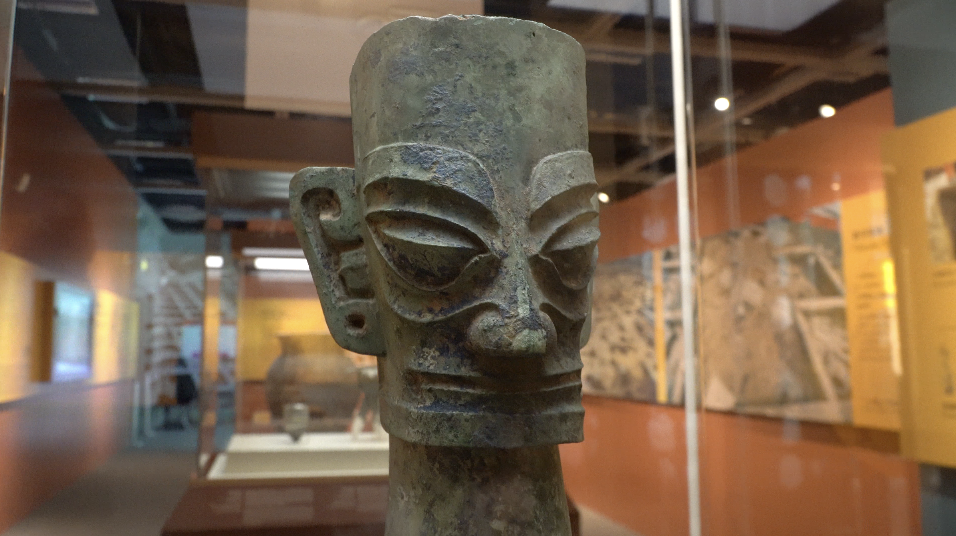 展覽的首件展品是出土於三星堆遺址的青銅人頭像。作為三星堆遺址最廣為人知的文物,青銅人頭像威嚴的神情,塑造出神聖、莊嚴的尊貴身份,也代表着神靈的象徵。這件具有象徵性、獨特性的展品也引領着觀眾漸入佳境。
