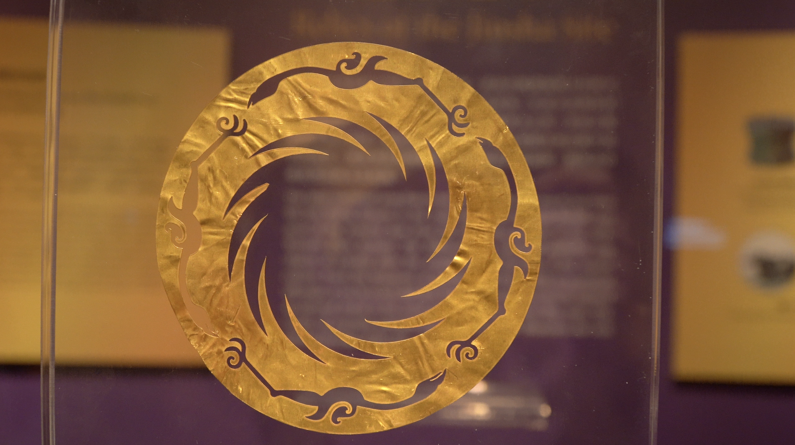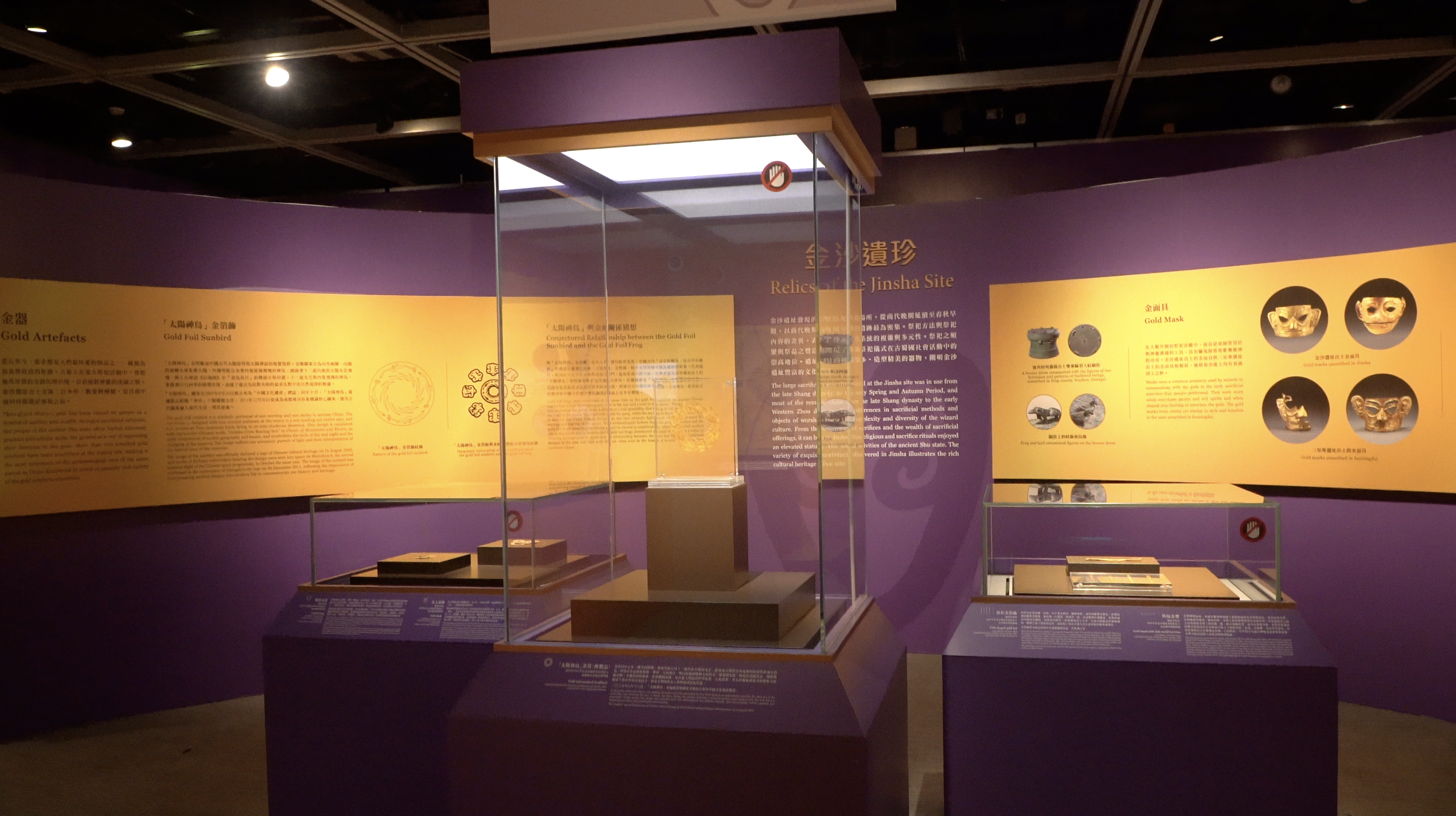 本次展覽最矚目的展品為金沙遺址中最重要的國寶級文物「太陽神鳥」金箔飾複製品,被放置於展廳正中央位置。金箔整個圖案似一副現代剪紙作品,四隻神鳥圍繞着12道太陽光芒飛翔,被認為是對太陽的崇拜。金箔厚度僅有0.02厘米,工藝精湛令人讚嘆不已。「太陽神鳥」將古蜀人豐富的哲學思想、宗教思想,非凡的藝術創造力與想像力和精湛工藝水準的完美結合,「國寶」之稱當之無愧。與「太陽神鳥」金箔飾一起出土的,還有八個蛙型金箔,學者認為兩者應組合使用,形成日月同構的精神意象。