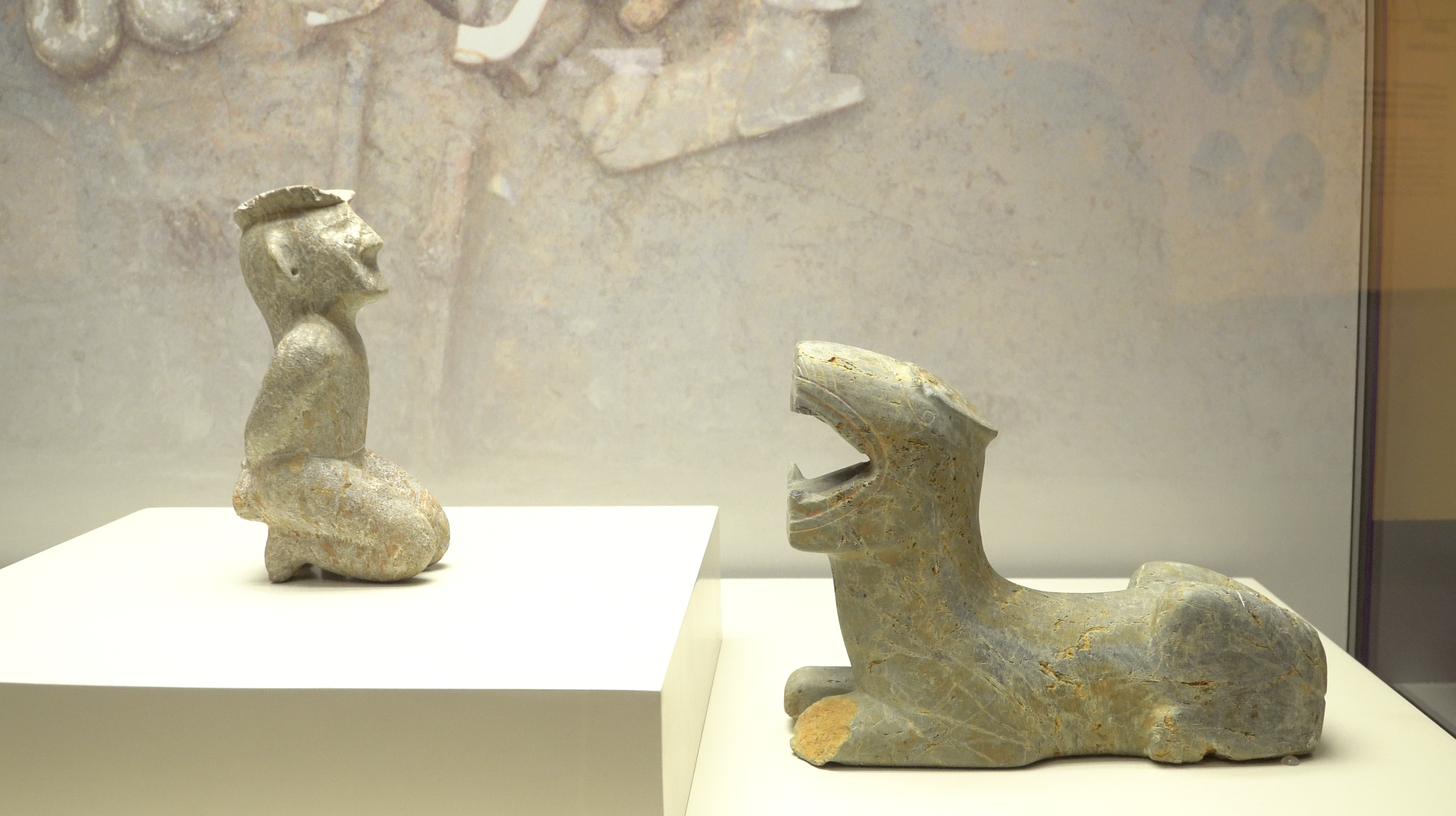 除一眾金器外,展覽還有青銅、玉、石器區域。展品中,青銅人形器是全國範圍內僅在金沙遺址出土的特色文物,而石器中較為特別的是在金沙遺址祭祀區十九號遺存內發現的跪坐石人像、石虎、石蛇及石壁組合。出土時,跪坐石人像與石虎並置,虎口正對人的胸膛,表現出「虎食人」的畫面,其特殊的擺放形式,可能具有某種巫術的含義。展館亦設有一個數字體驗空間,市民可在四面大型屏幕內沉浸式感受2001年考古現場,各類文物出土時的情況。