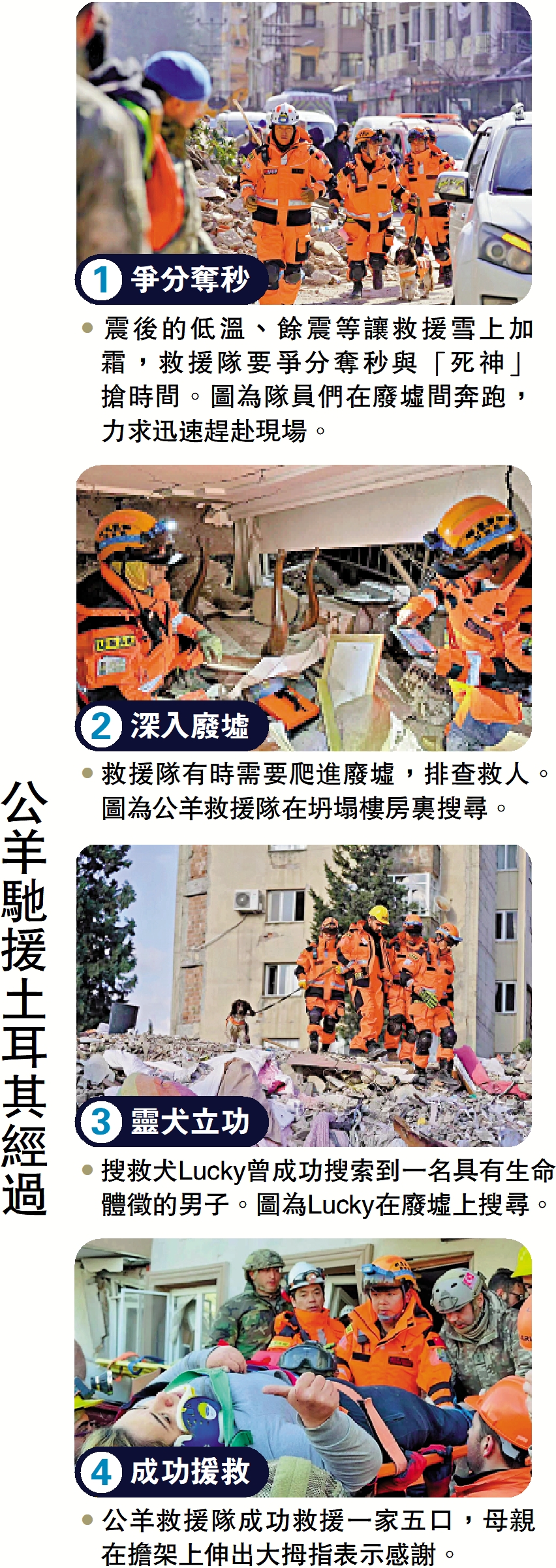「他們是由8位富有國際救援經驗的地震救援專家組成的『先遣隊』,在伊斯坦布爾見到他們的時候,他們就攜帶着先進的雷達生命搜索儀、破拆救援裝備。」「搜救犬Lucky更是訓練有素,搜尋首日就找到一名倖存者。」