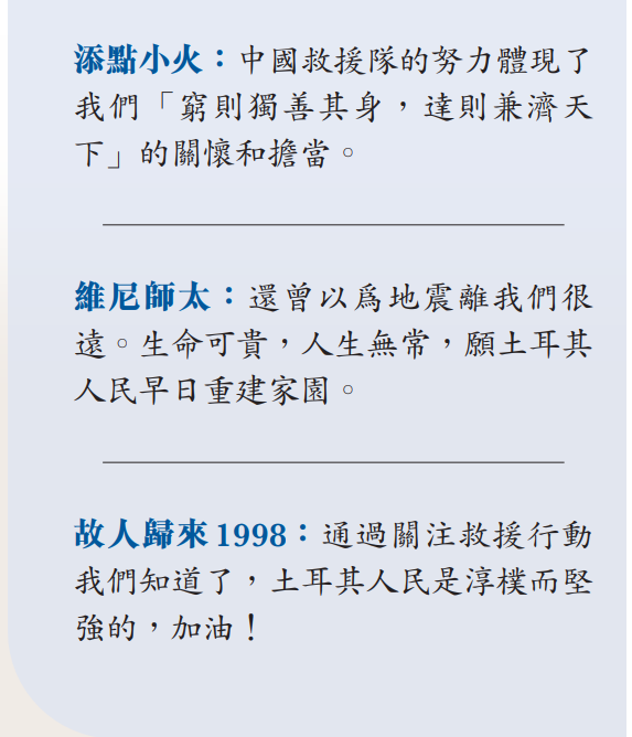 徐加愛表示,土耳其強烈地震造成重大人員傷亡和財產損失,牽動中國政府和中國人民的心。按照黨中央、國務院部署,中國救援隊日夜兼程萬里馳援,中國香港特區政府也迅速派出救援隊,與中國救援隊並肩作戰。兩支隊伍克服重重困難,不拋棄、不放棄,爭分奪秒同「死神」賽跑、為生命接力,多次創造生命救援奇跡,出色完成國際救援任務。