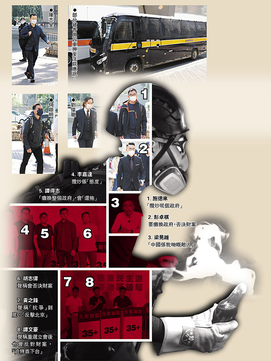 已認罪的被告譚文豪則在論壇上聲稱:「只要返到去我哋有『35+』,任何的政府法案、任何撥款且最緊要的這個財政預算案,我們都會投反對票,即使解散立法會後重選也會再次反對,迫使特首下台。」