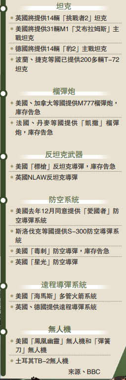 《金融時報》指出,持續近12個月的俄烏衝突給歐洲準備不足的國防部門帶去巨大壓力。北約成員國所持有的蘇聯武器庫存已經耗盡,而歐洲工廠生產的炮彈只能勉強滿足烏克蘭一周的需求。雖然美國、德國等陸續宣布向烏克蘭提供M1系列坦克、「豹2」坦克等新型武器,但可能需要數周甚至數月的整修才能交付。卡內基歐洲中心高級研究員鄧普西說:「烏克蘭的情況並不樂觀。他們什麼都缺。」