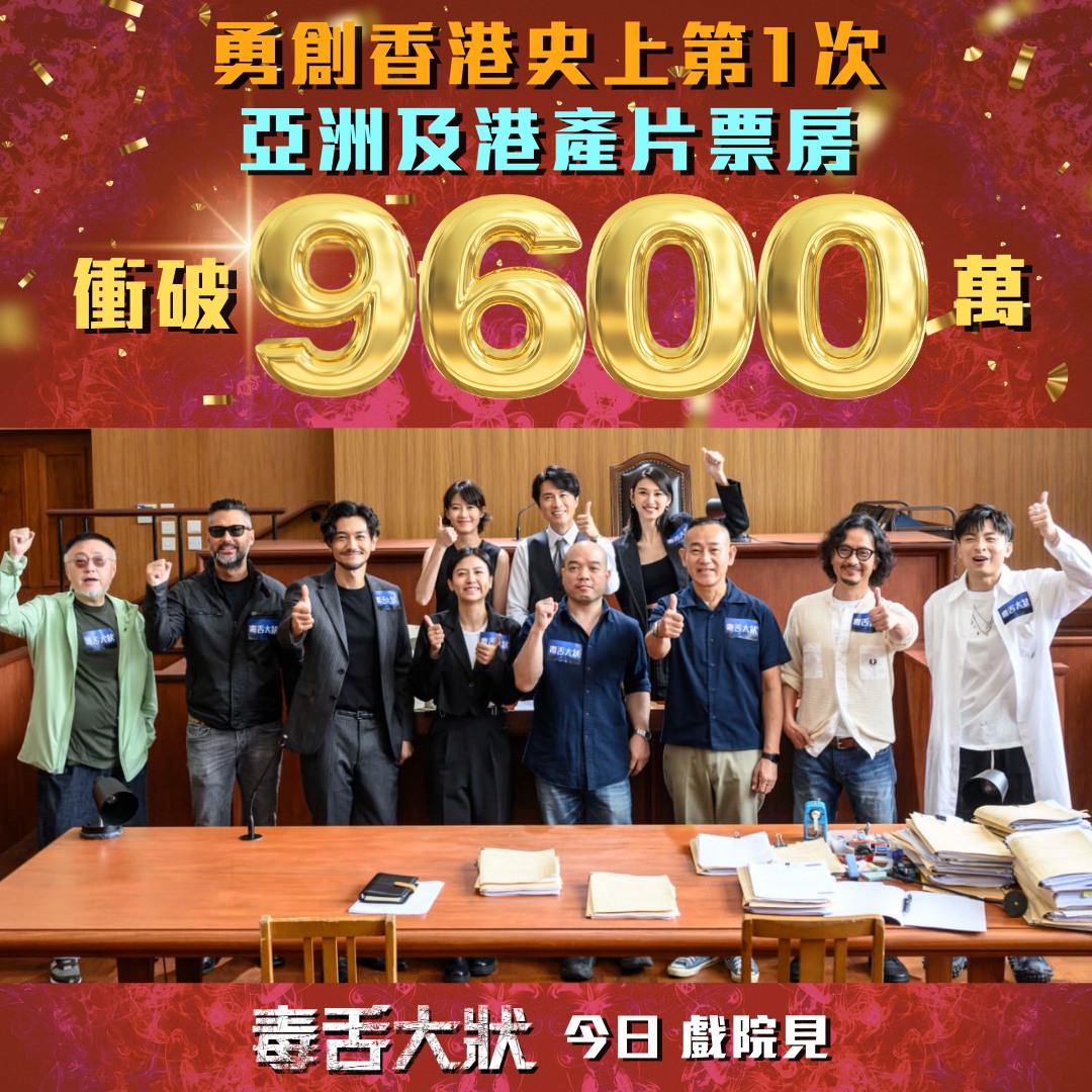 大公文匯全媒體報道:香港賀歲電影《毒舌大狀》,繼昨天(17日)宣布衝破9500萬票房,事隔1日,今天(18日)再宣布票房已衝破9600萬,創香港電影史上亞洲及港產片票房紀錄。