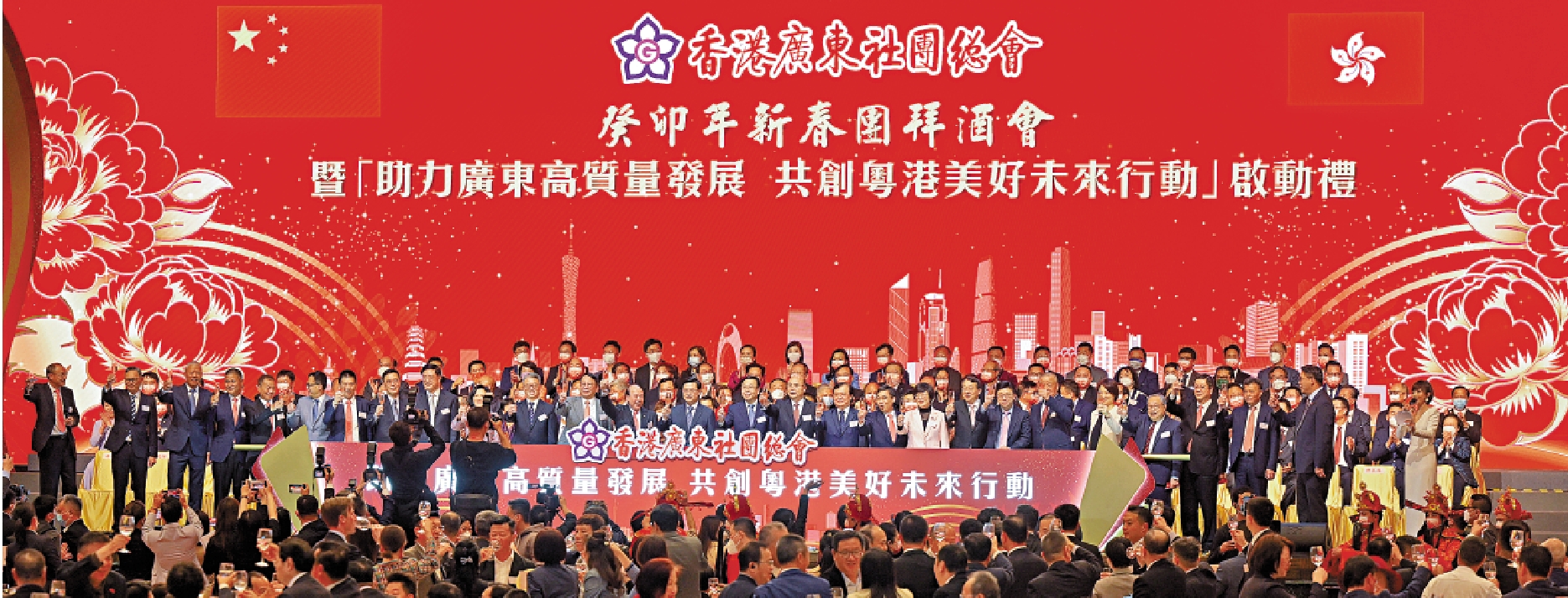 (大公報記者 吳俊宏、林雅雯、李同風)香港廣東社團總會癸卯年新春團拜酒會暨「助力廣東高質量發展 共創粵港美好未來行動」啟動禮昨日下午於香港會議展覽中心隆重舉行,氣氛熱烈。