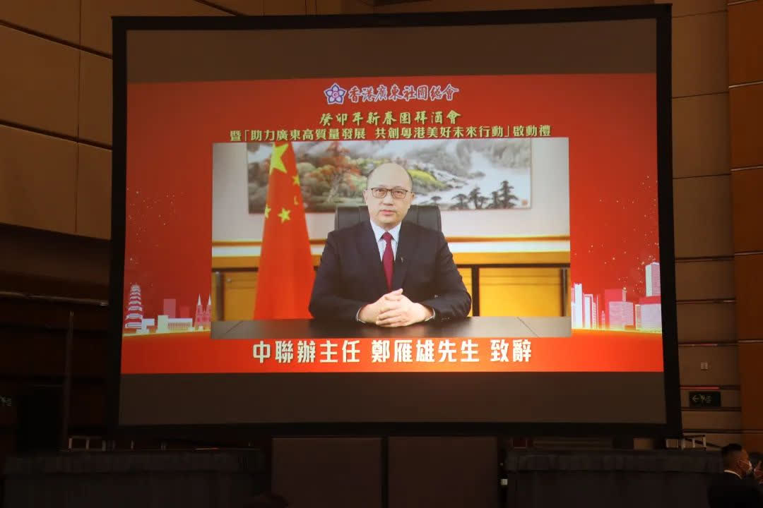 中聯辦主任鄭雁雄在香港廣東社團總會癸卯年新春團拜酒會上以粵語發表致辭視頻,現場逾千位粵籍社團代表倍感同聲同氣。香港廣東社團總會主席龔俊龍說,鄭主任致辭中提出了三點希望,是對同鄉社團的全新定位,會全力做好愛國愛港力量的排頭兵,助力國家同香港高質量發展。