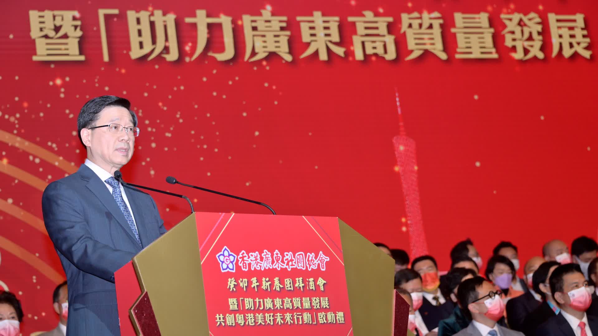 廣東省委常委、統戰部部長王瑞軍及香港廣東社團總會主席龔俊龍亦在會上發表致辭。中聯辦副主任何靖、駐港國安公署副署長孫青野、外交部駐港公署副特派員方建明、特區政務司司長陳國基等各界嘉賓,以及在港粵籍鄉親1200多人出席了活動。