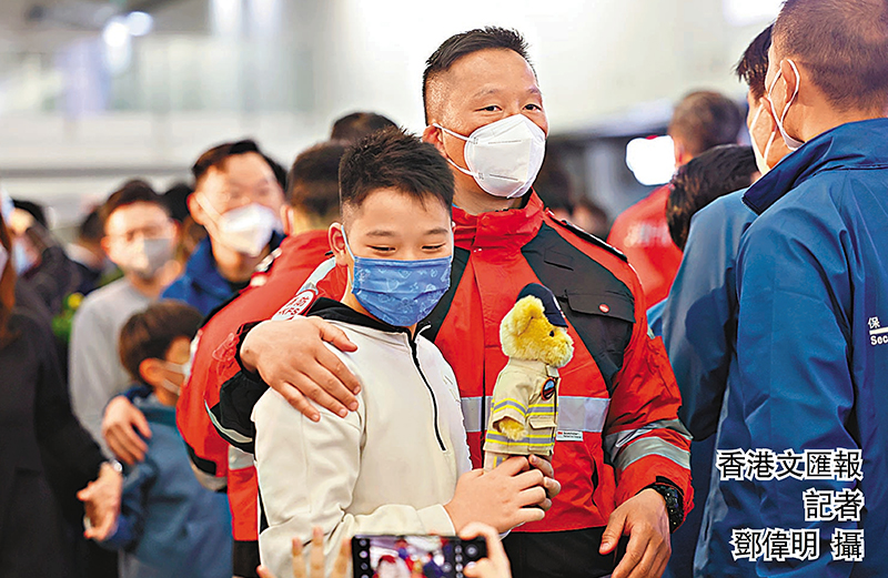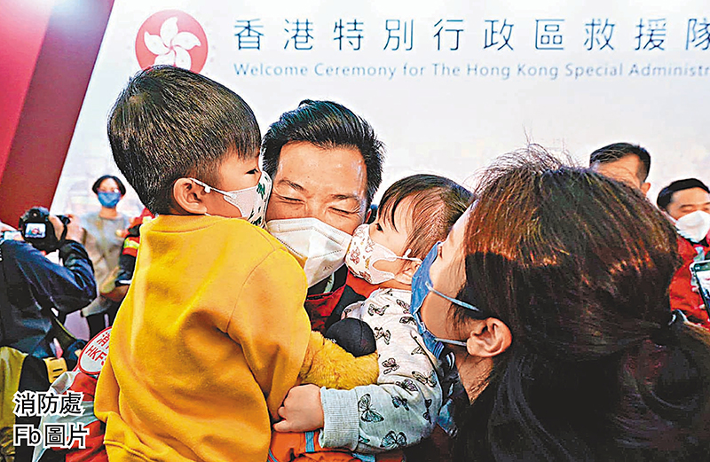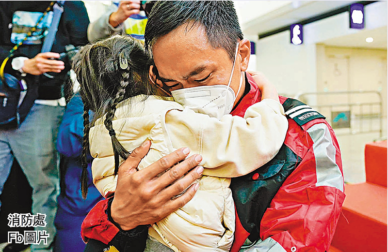 (香港文匯報記者 文森)土耳其發生7.8級強烈地震後,香港特區政府派出59人救援隊遠赴當地,與國家救援隊會合後在災區協助搜救。冒着持續不斷的餘震、嚴寒、物資供應緊張,香港救援隊爭分奪秒拯救生命,先後救出4名生還者。昨日凌晨,他們返抵香港與闊別多日的家人團聚,其間有隊員抱起一雙兒女時流下男兒淚。經歷過天災,更顯港人身在福中,特區救援隊指揮官于文陽表示,「香港是一個福地,一個這麼美麗的城市,我很希望大家繼續愛惜這個城市,一起保護它,一起建設它。」不少居港土耳其人也前來接機,感激救援隊無私大愛精神。
