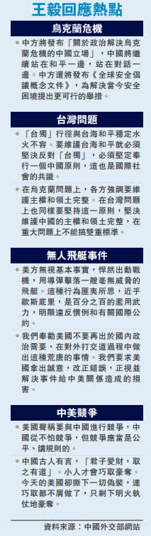王毅發表主旨講話後就烏克蘭問題回答提問。王毅表示,烏克蘭危機不是我們願意看到的,我們同各方一樣,對衝突擴大化、長期化感到擔憂。中國不是烏克蘭危機的當事方,但我們沒有袖手旁觀,不去火上澆油,更反對趁火打劫。中國所做的一切,歸結為一句話,就是勸和促談。我們將繼續堅定地站在對話一邊,站在和平一邊。