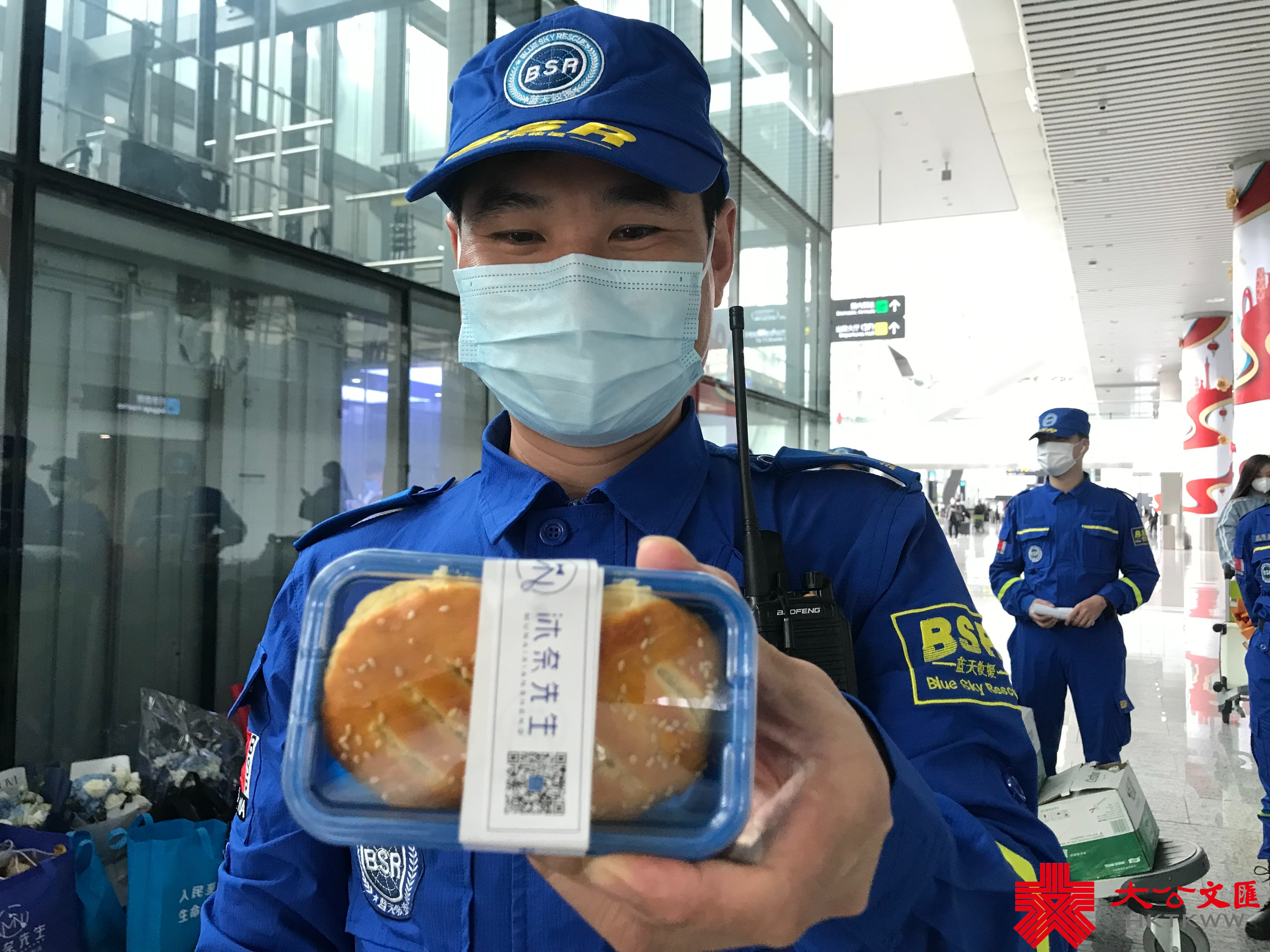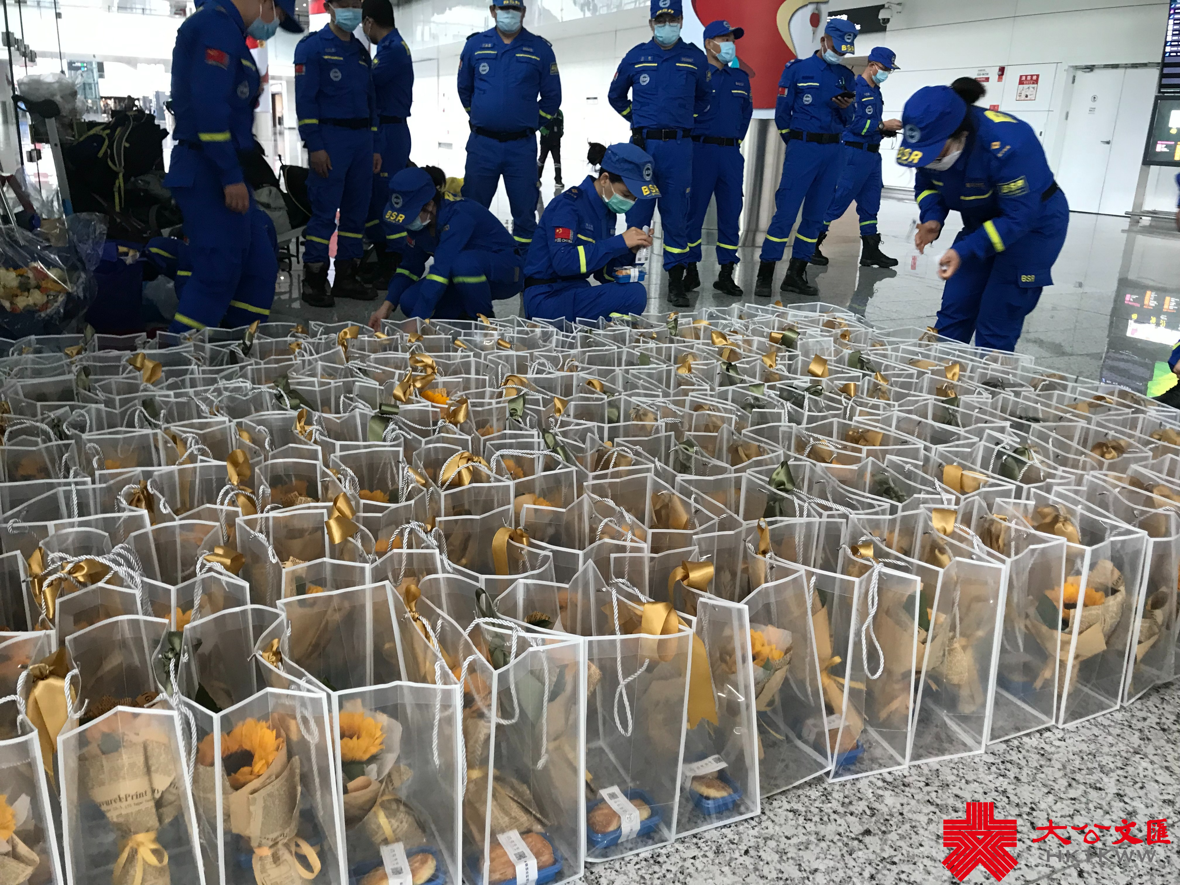 記者看到,現場準備了大量迎接的鮮花,袋子裏還有廣式點心。據廣東藍天救援隊品牌督導官郭台偉介紹,赴土救援的隊友,反映最多的是飲食不習慣,手部也多開裂,非常辛苦,為此,為了讓他們感受到來自隊友、來自祖國的溫暖,他們除了準備了鮮花,還特地準備了一些廣式點心,139名隊員都能第一時間先生享用。