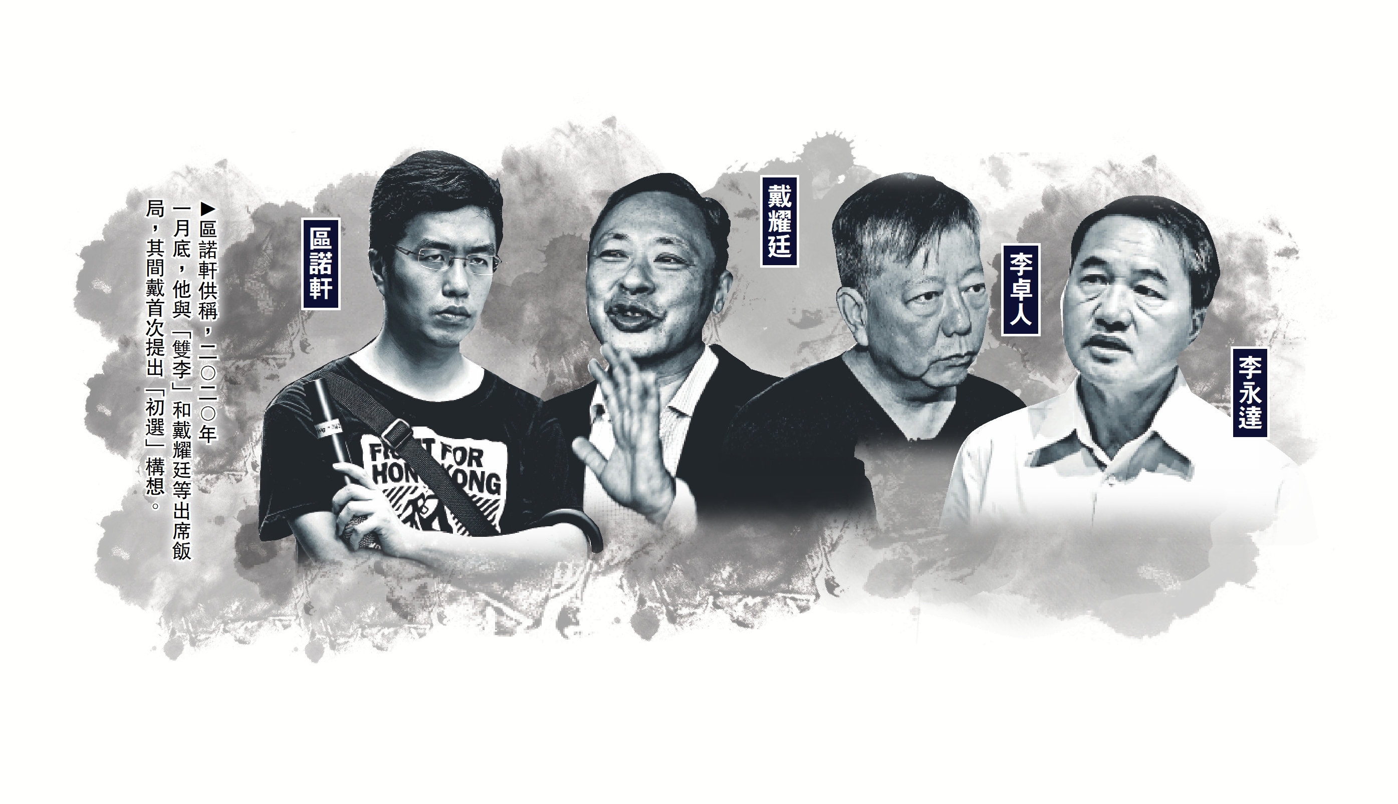 區諾軒稱,「一切由一個飯局開始」。2020年1月底,他與李永達、李卓人、黃浩銘和戴耀廷共同出席一個飯局,其間戴首次提出有關「初選」的構想,並揚言若取得過半議席,將會是「大殺傷力的憲制武器」,屆時民主派將對政府有更大的議價能力,並可利用基本法賦予的權力行使否決權。
