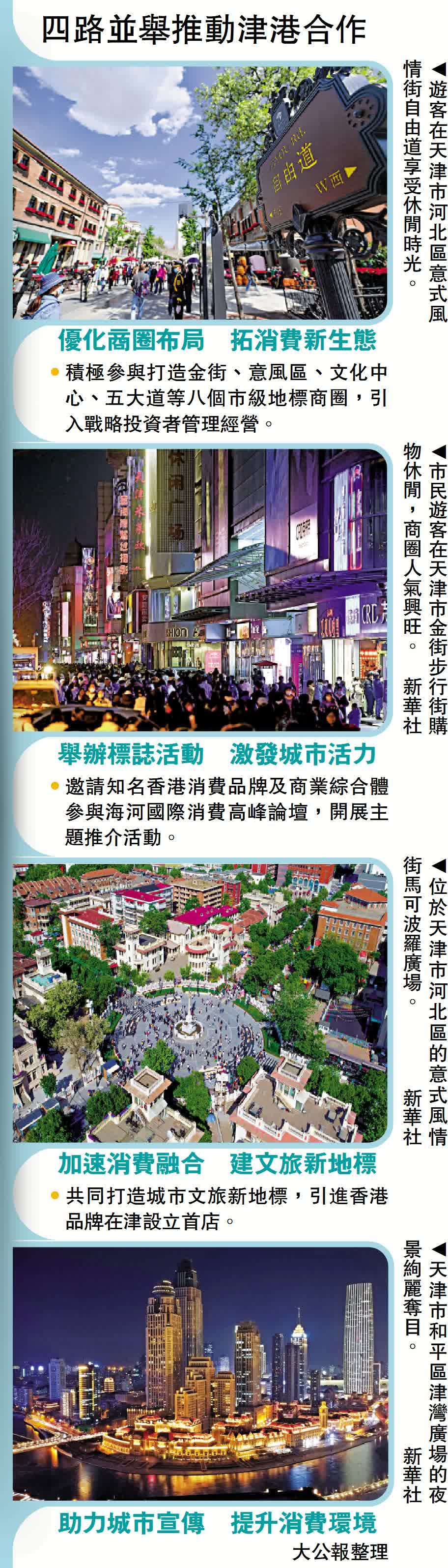 圍繞津港兩地合作,天津市副市長朱鵬提出四點建議,一是參與優化商圈布局,共同構建消費新生態。積極參與打造金街、意風區、文化中心、五大道等八個市級地標商圈,引入戰略投資者管理經營。二是共同舉辦標誌活動,激發城市活力。邀請知名香港消費品牌及商業綜合體參與海河國際消費高峰論壇,開展主題推介活動。三是加速消費融合,構建新場景。共同打造城市文旅新地標,引進香港品牌在津設立首店。四是助力城市宣傳,提升消費環境。