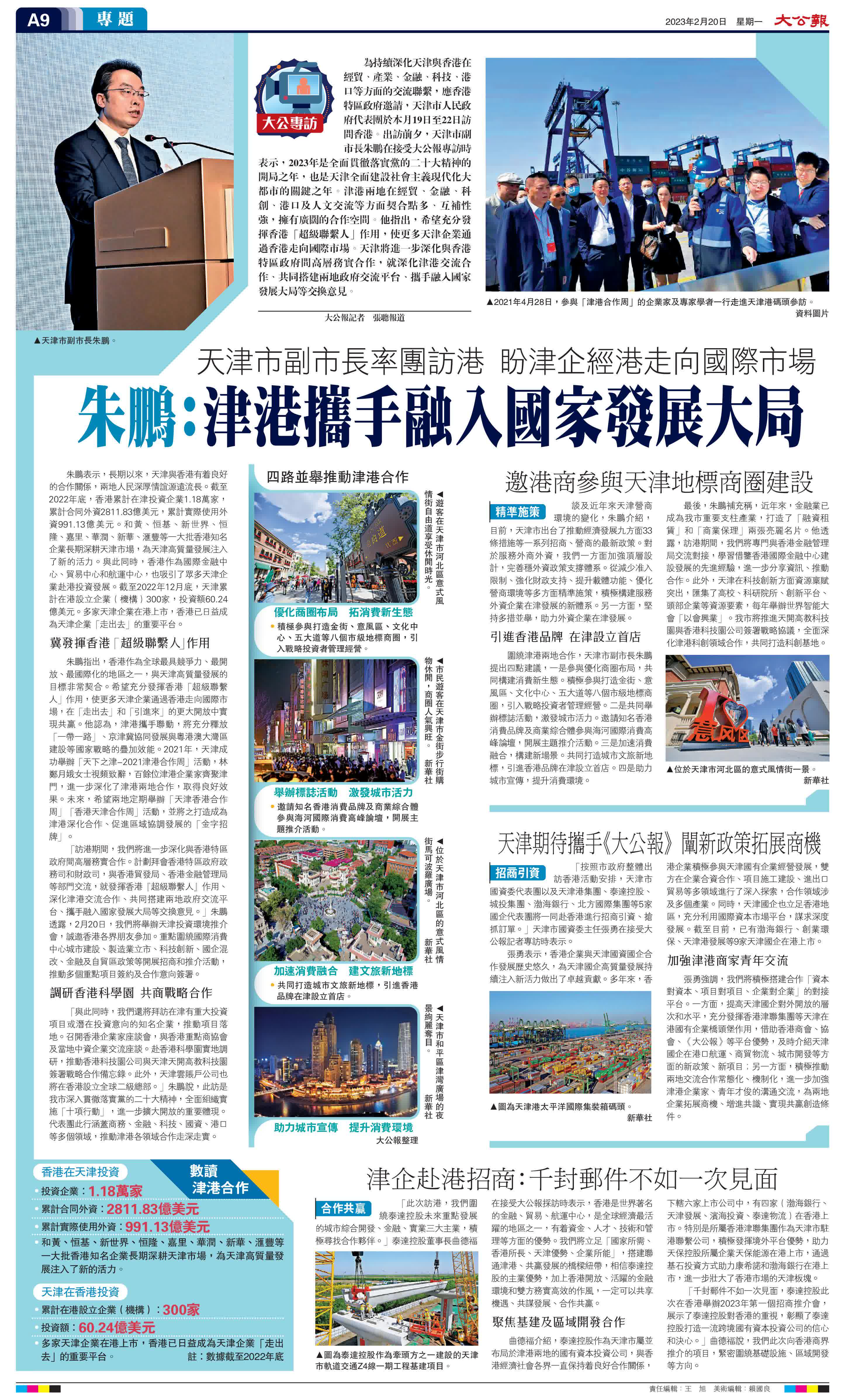 (大公報 記者 張聰)為持續深化天津與香港在經貿、產業、金融、科技、港口等方面的交流聯繫,應香港特區政府邀請,天津市人民政府代表團於本月19日至22日訪問香港。出訪前夕,天津市副市長朱鵬在接受大公報專訪時表示,2023年是全面貫徹落實黨的二十大精神的開局之年,也是天津全面建設社會主義現代化大都市的關鍵之年。津港兩地在經貿、金融、科創、港口及人文交流等方面契合點多、互補性強,擁有廣闊的合作空間。他指出,希望充分發揮香港「超級聯繫人」作用,使更多天津企業通過香港走向國際市場。天津將進一步深化與香港特區政府間高層務實合作,就深化津港交流合作、共同搭建兩地政府交流平台、攜手融入國家發展大局等交換意見。