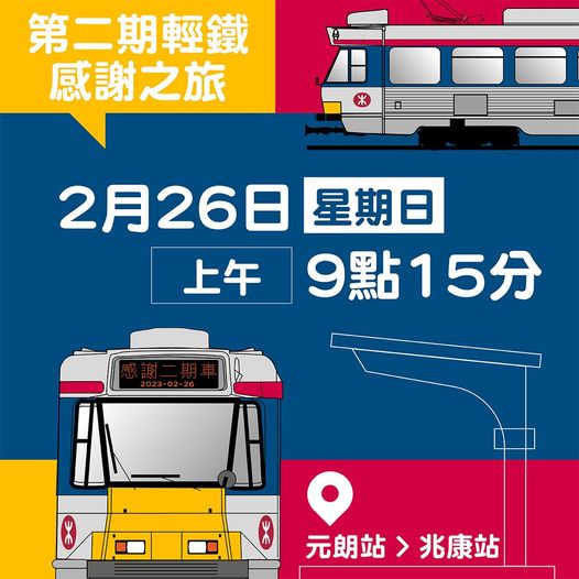 - 地點:由輕鐵元朗站一號月台開往輕鐵兆康站四號月台,之後在兆康站稍作停留供市民拍照留念