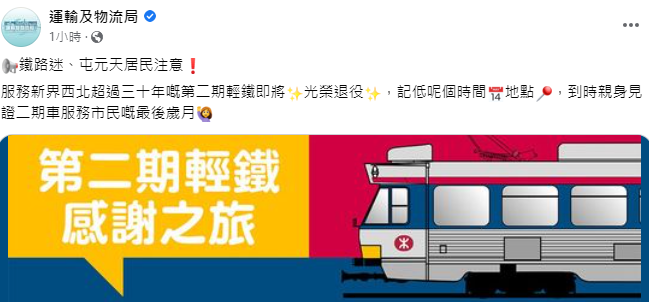 大公文匯全媒體報道,港鐵今日(20日)在社交網站宣布,服務新界西北三十載的輕鐵第二期列車,即將光榮退役。港鐵將於本周日(26日)舉辦感謝之旅,特別班次將於早上9時15分在元朗輕鐵站開出,讓市民以及鐵路迷們把握機會,欣賞二期列車的行駛英姿。