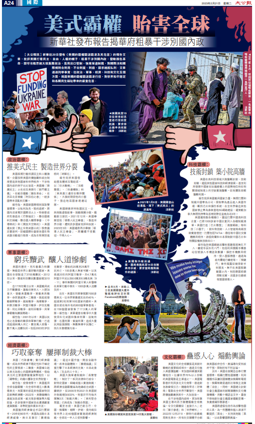 新華社20日發布《美國的霸權霸道霸凌及其危害》的報告文章,批評美國打着民主、自由、人權的幌子,粗暴干涉別國內政,發動顏色革命,固守冷戰思維大搞集團政治,濫用出口管制,強推單邊制裁,對國際法和國際規則合則用,不合則棄、則廢,謀求維護私利。文章通過列舉事實,從政治、軍事、經濟、科技和文化五個方面,揭露美國的霸權霸道霸凌行徑,對世界和平穩定和各國民生福祉帶來的嚴重危害。