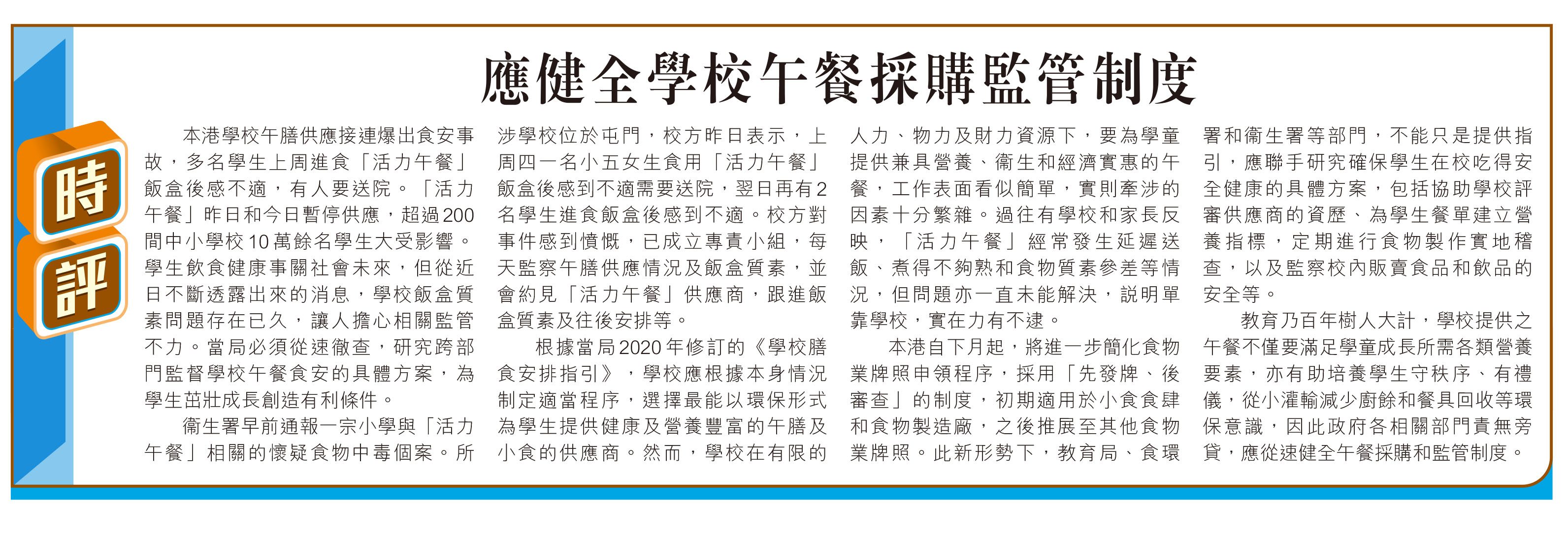 本港學校午膳供應接連爆出食安事故,多名學生上周進食「活力午餐」飯盒後感不適,有人要送院。「活力午餐」昨日和今日暫停供應,超過200間中小學校10萬餘名學生大受影響。學生飲食健康事關社會未來,但從近日不斷透露出來的消息,學校飯盒質素問題存在已久,讓人擔心相關監管不力。當局必須從速徹查,研究跨部門監督學校午餐食安的具體方案,為學生茁壯成長創造有利條件。