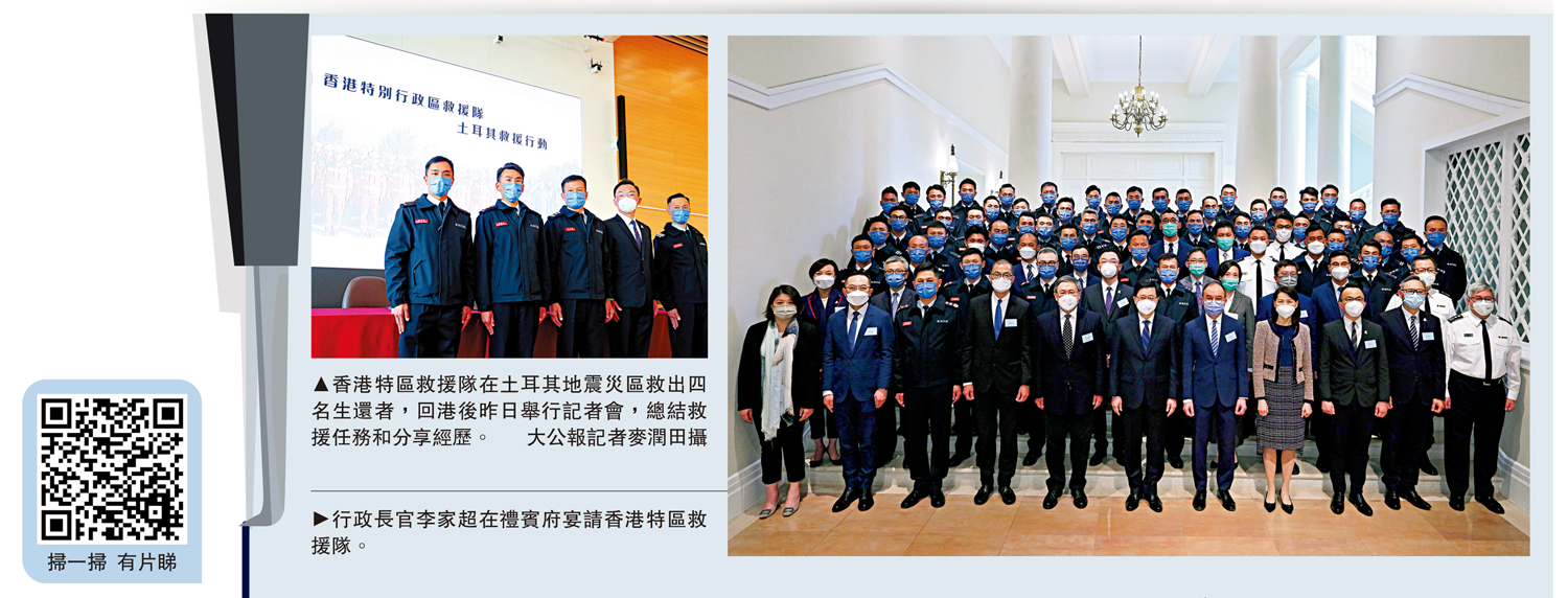 (大公報 記者 葉浩源)土耳其7.8級強烈地震至今已造成超過4萬人死亡,香港特區政府首次派遣救援隊遠赴海外協助賑災救援,救出10名被困者,當中4人生還,不負所託完成使命,所有隊員和搜救犬日前已平安回家。特區救援隊昨日(20日)舉行記者會總結救援任務,包括多次應當地居民要求,前往可能有生還者被困的瓦礫堆上搜索,最終成功營救4人。