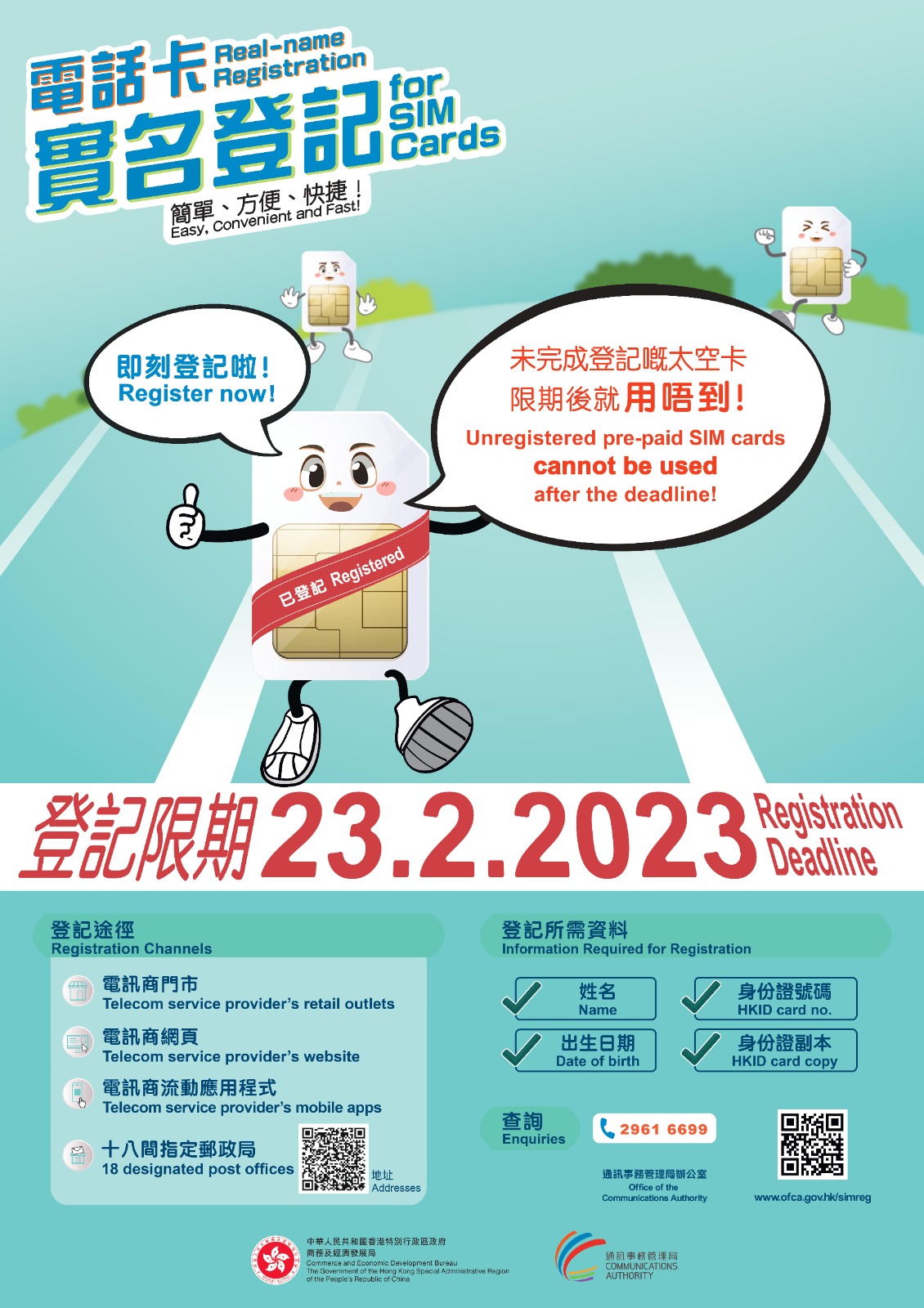 梁仲賢在一個電台節目指,已要求電訊商延長門市營業時間,協助市民登記的郵局亦會在本周三及周四延長服務時間,以便市民登記。他提醒,若市民在過了限期後登記,只要電話卡仍在有限期內或有儲值額,仍可向電訊商要求補辦登記。