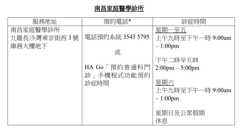 大公文匯全媒體報道,九龍西醫院聯網發言人今日(21日)宣布,位於九龍長沙灣東京街西3號庫務大樓地下的南昌家庭醫學診所將於3月1日(星期三)起投入服務。屆時,偶發性疾病病人可透過普通科門診電話預約系統3543 5795或醫院管理局手機應用程式HA Go內的「預約普通科門診」功能預約診症時間。