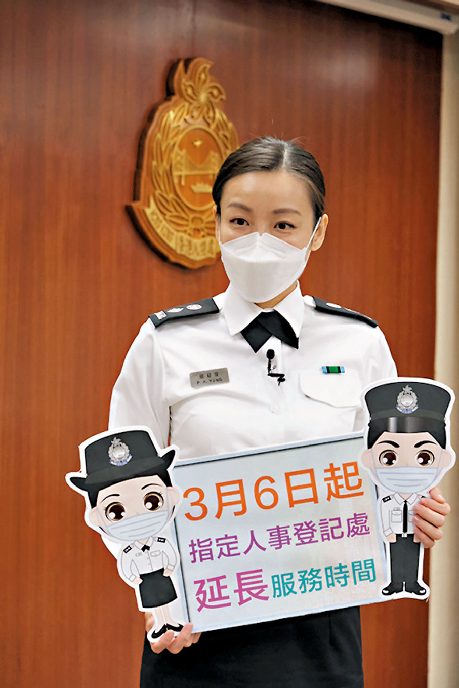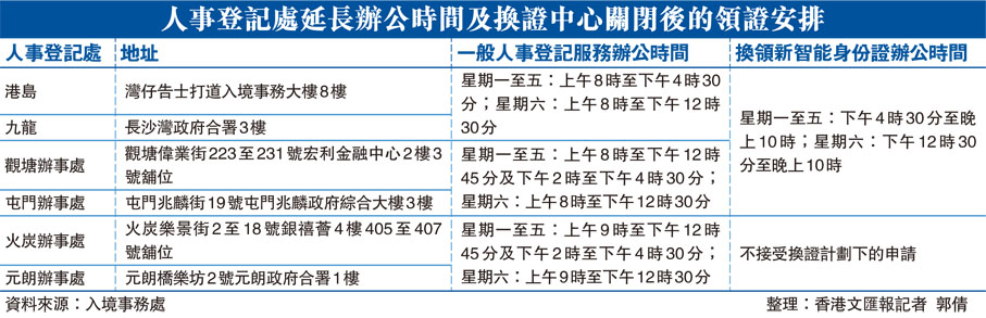 由下月6日起,將延長港島、九龍、觀塘及屯門4間人事登記處的服務時間,星期一至六開放時間將提早於早上8時、辦公時間則延長至晚上10時。只有延長的服務時段、即星期一至五下午4時半以後,或星期六下午12時半以後,專門辦理新證服務,市民可前往這4間登記處辦理換證手續。而網上預約系統將會在下月4日開始運作,市民可透過網上或入境處流動應用程式預約。