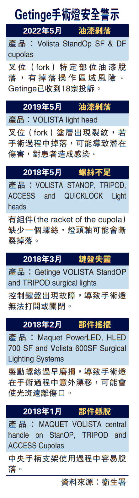大公報記者翻查資料發現,Getinge手術燈於過去五年至少有6宗衞生署有紀錄的安全警示,包括油漆剝落、部件較易鬆脫或搖擺、控制鍵盤失靈及手術燈缺少一顆螺絲等。Getinge亦曾於去年向美國食品藥品監督管理局(FDA)報告其中一款手術燈發生遺失螺絲事件,但未有向醫管局通報。