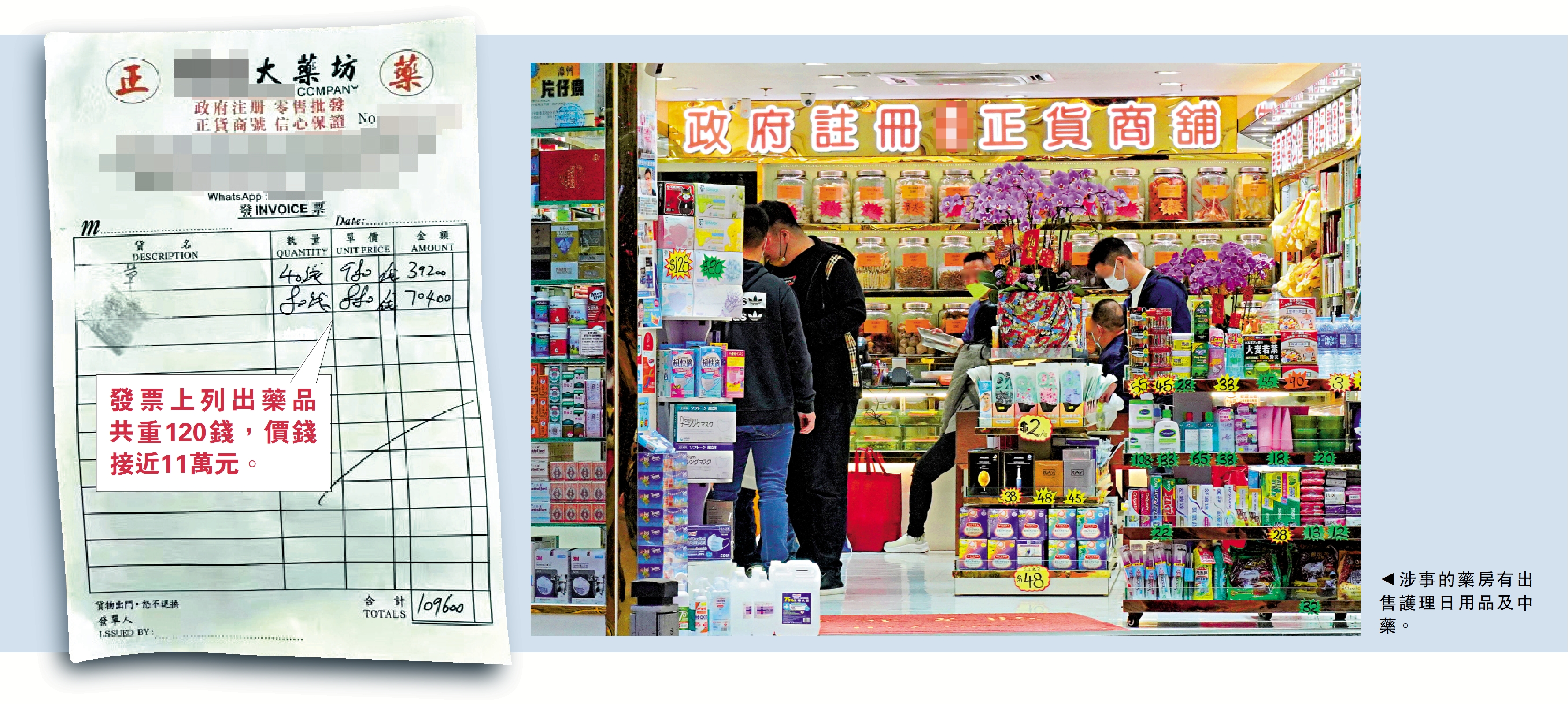 (大公報記者 盛德文、黃山<文、圖> 伍軒沛<文>)香港與內地恢復全面通關僅半個月,遊客常到的銅鑼灣近日驚現天價藥粉風波。有內地遊客在社交網站發帖文,稱被藥店游說購買中藥,付款時才驚覺120錢的藥粉,竟索價近11萬元,事主聯絡香港海關跟進。大公報記者昨日聯絡到事主,她指「事情已處理」,並說「以後還是會來香港的。」