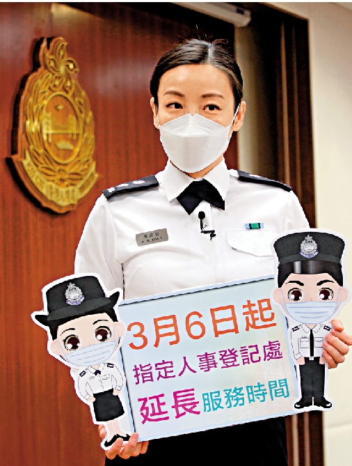 她指出,入境處過去幾個月,平均每月處理約4.3萬宗申請,而上月即使有新年假期,申請人數反增至45000宗。延長中心開放時間後,入境處會確保中心有足夠人手,目標是把人事登記處的整體申請數量,由疫情前平均每星期處理約10000宗申請,提升大約八成,至每星期最多可處理約18000宗申請。