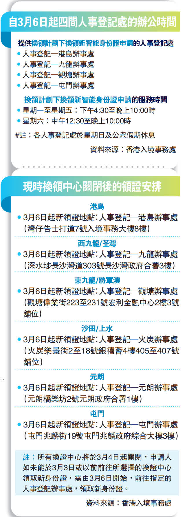 為照顧仍未申請換證的市民,入境處首度延長人事登記處的服務,3月6日起,4間分別位於港島、九龍、觀塘及屯門的人事登記處,服務時間延長至晚上10時,並將延長服務的時段分配予參與全民換證計劃的人士,有需要的市民可由3月4日起,透過網站或入境處流動應用程式進行預約。