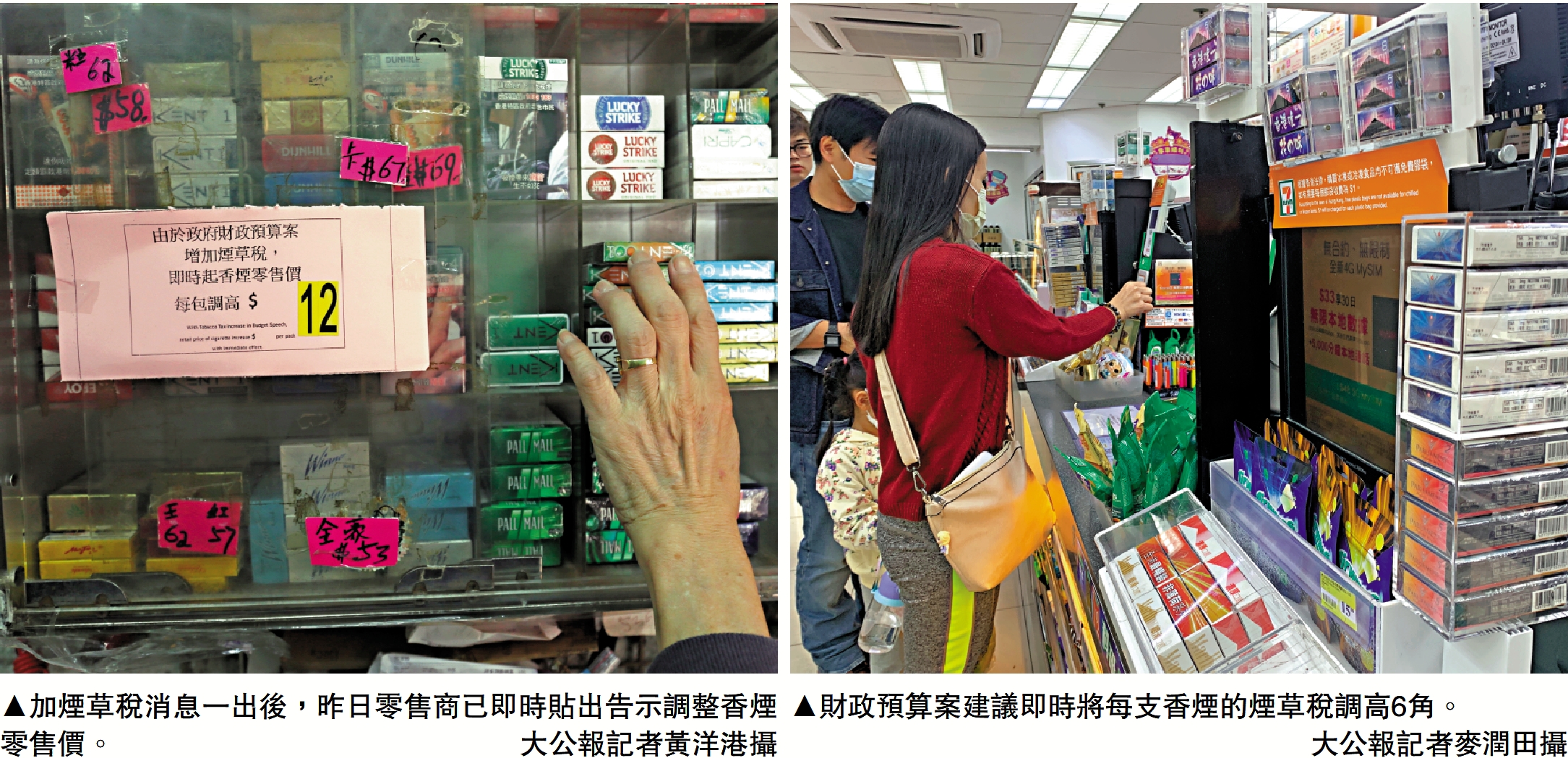 本港煙草稅已連續八年凍結,綜合各方面考量後,政府即日起增加煙草稅逾31.48%,以一包有20支香煙計算,即每包香煙零售價由62元加至現時的74元,每包香煙加價12元。政府消息人士預計,加稅將為庫房每年增加10億元稅收,同時會因應控煙成效持續檢視有關措施。消息一出後,昨日中午時分多間便利店即時貼出告示指「因應煙草稅及營運成本增加,部分香煙之零售價每包加港幣12元。」