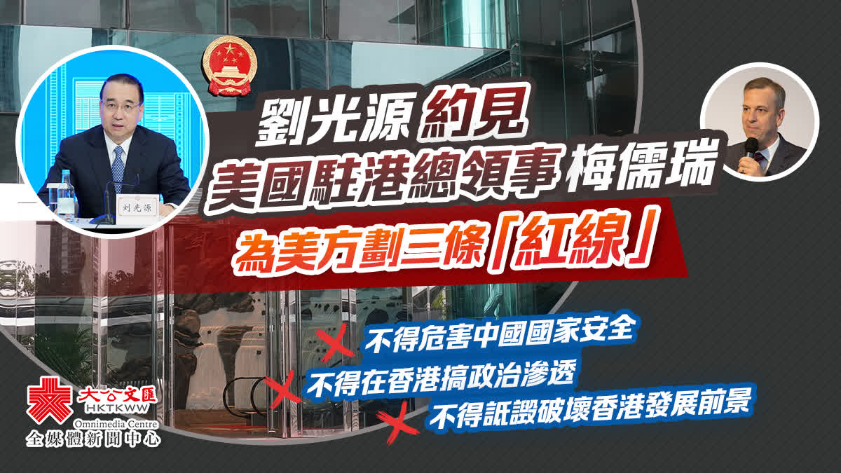 大公文匯全媒體報道,外交部駐港特派員公署發言人今日(23日)應詢表示,劉光源特派員近日約見美國駐港總領事梅儒瑞,就美總領事和總領館近期一系列干預香港事務的錯誤言行提出嚴正交涉,表達強烈不滿,敦促其恪守外交官職業操守,不要在錯誤道路上越走越遠,並為美總領事和總領館劃出三條「紅線」,要求美方不得危害中國國家安全,不得在香港搞政治滲透,不得詆譭破壞香港發展前景。