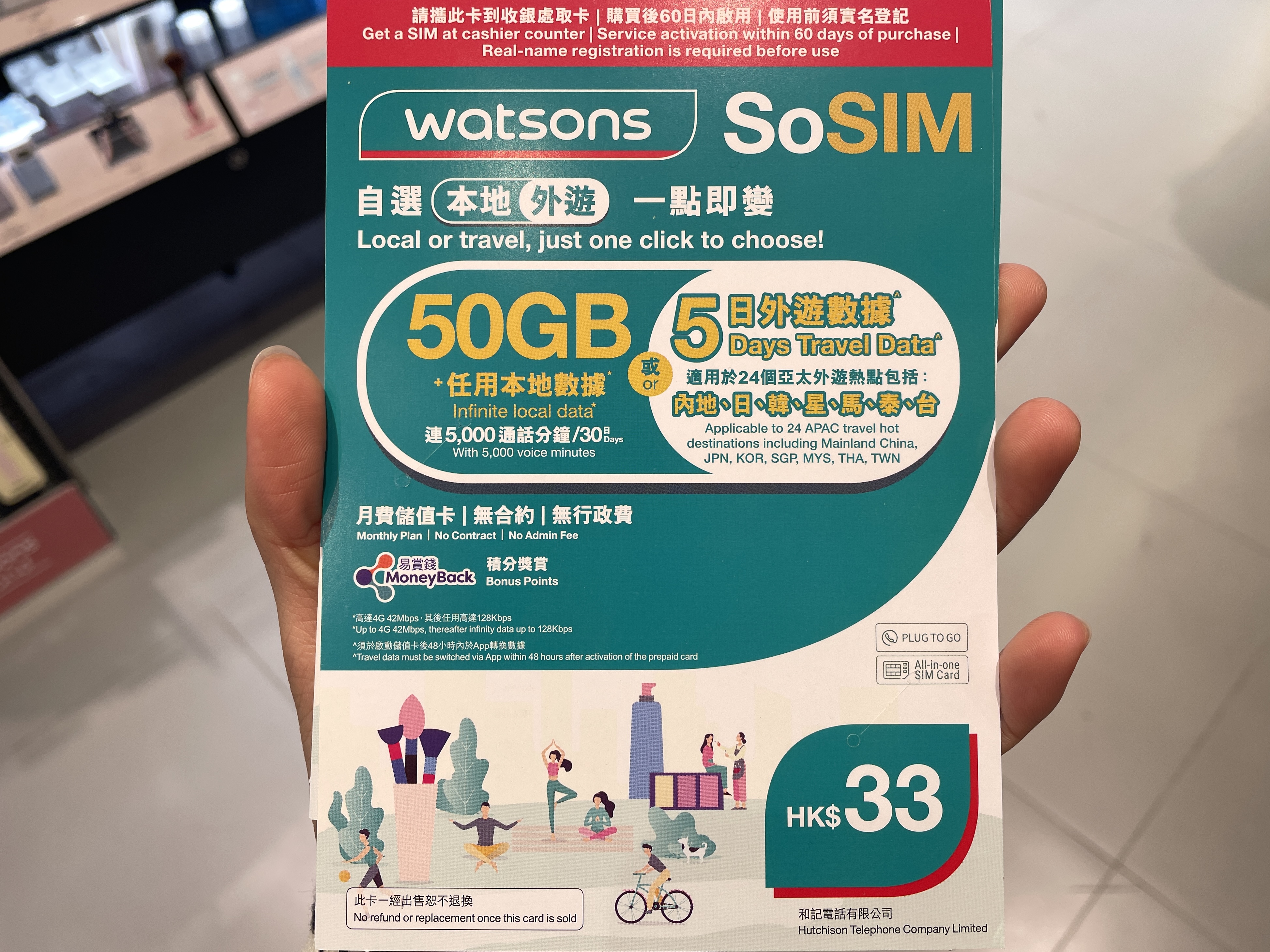 港島一間屈臣氏店員說,現時有33元套餐的電話卡,含有50GB流量數據,可以使用30天。另外,為了方便旅客,除33元的套餐之外,在購買電話卡後,旅客還可以在屈臣氏App內選擇幾日的流量套餐,價格比較便宜。需要注意的是,屈臣氏電話卡會在開啟後的兩個月內失效。