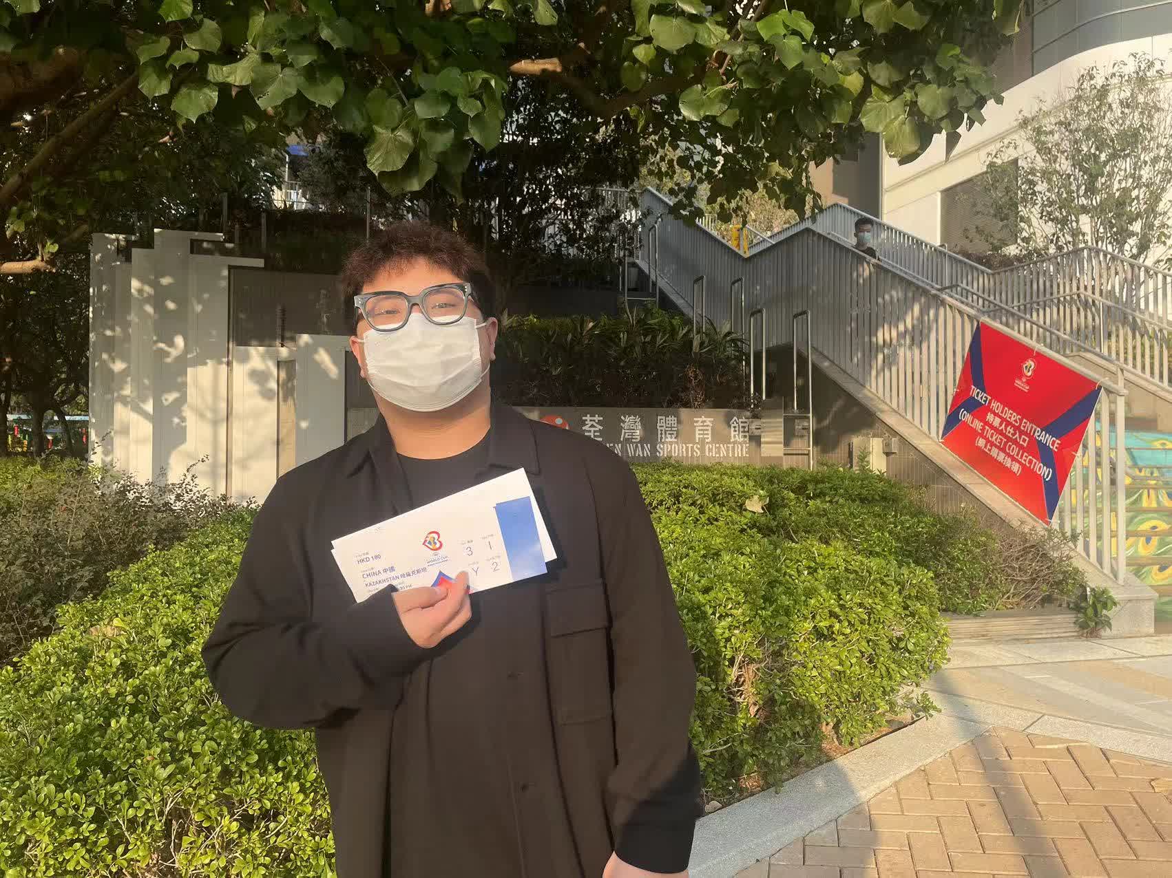 關小姐:很難得搶到票,心情非常激動。自己本身住在香港,由於難得舉行國際大賽,因此非常受歡迎,感覺比賽門票比陳奕迅演唱會的票還難買。這是疫情以來香港第一次舉辦的大型體育比賽,就迎來了國家隊的主場比賽,非常興奮,希望日後香港能舉辦更多國際賽事,自己只要買到票就一定會再來支持國家隊。